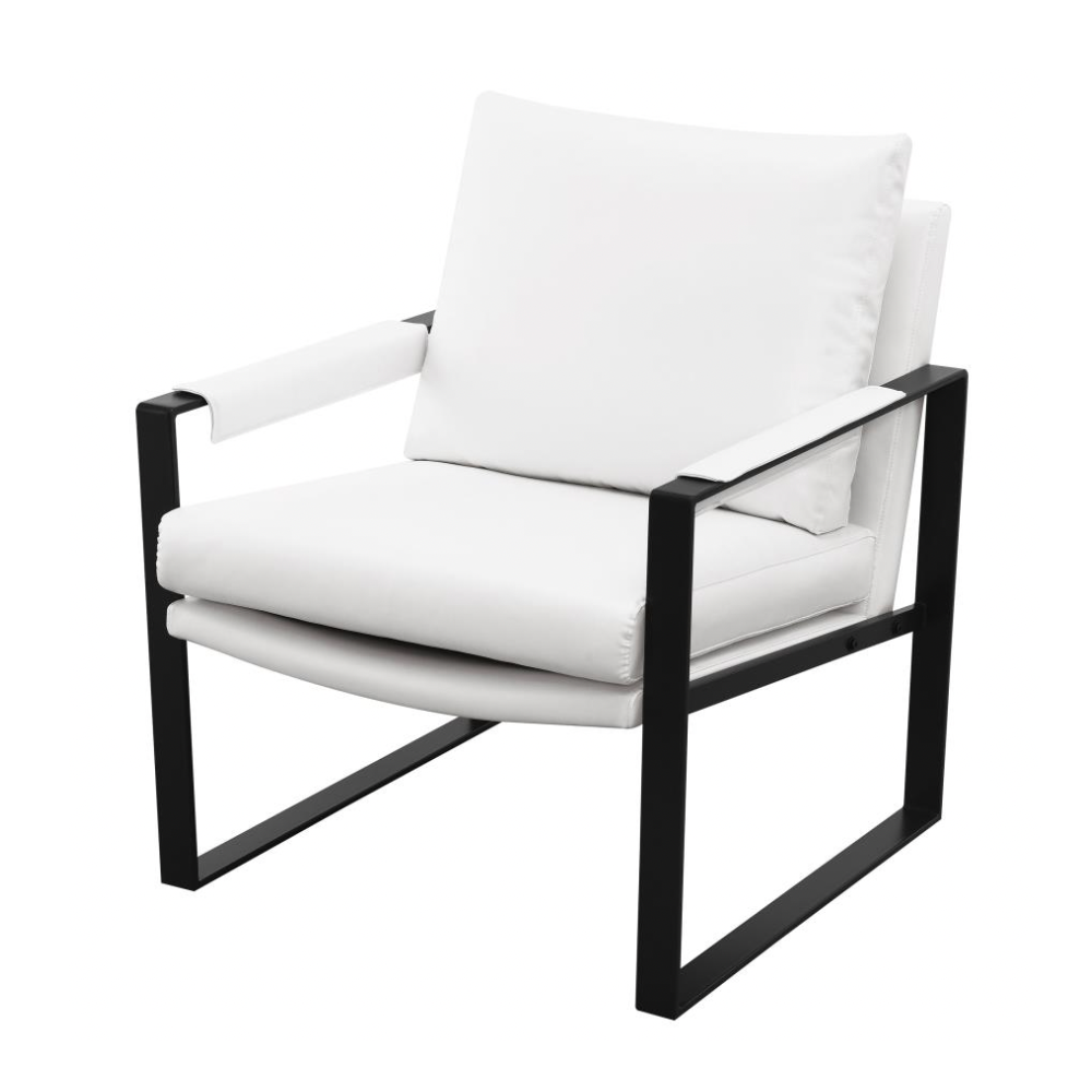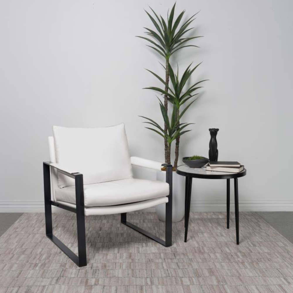 The Rosalind accent chair combines modern style with a retro touch, making it a perfect fit for your casual living room or home office. Upholstered in eco-friendly vegan leather, it offers both comfort and sustainability, while its gunmetal-finished metal frame adds an industrial flair. The removable seat and generously padded back cushion ensure a cozy seating experience.