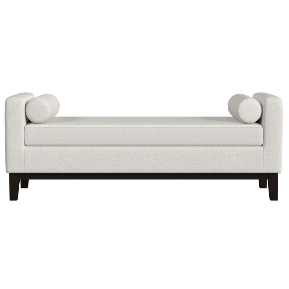 Elevate your bedroom or living space with this modern upholstered bench, blending simplicity and elegance. The backless design is accentuated by straight track arms, creating a sleek and contemporary silhouette. Two round bolster pillows soften the look while adding style and support. The foam-cushioned seat offers plush comfort, making it perfect for lounging or extra seating. Resting on a sturdy wooden base with tapering legs in a striking black finish, this bench brings a touch of contrast and dimension to any decor.