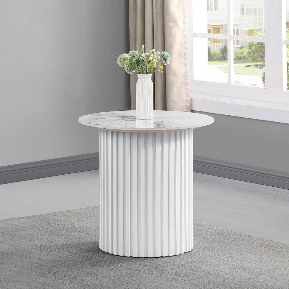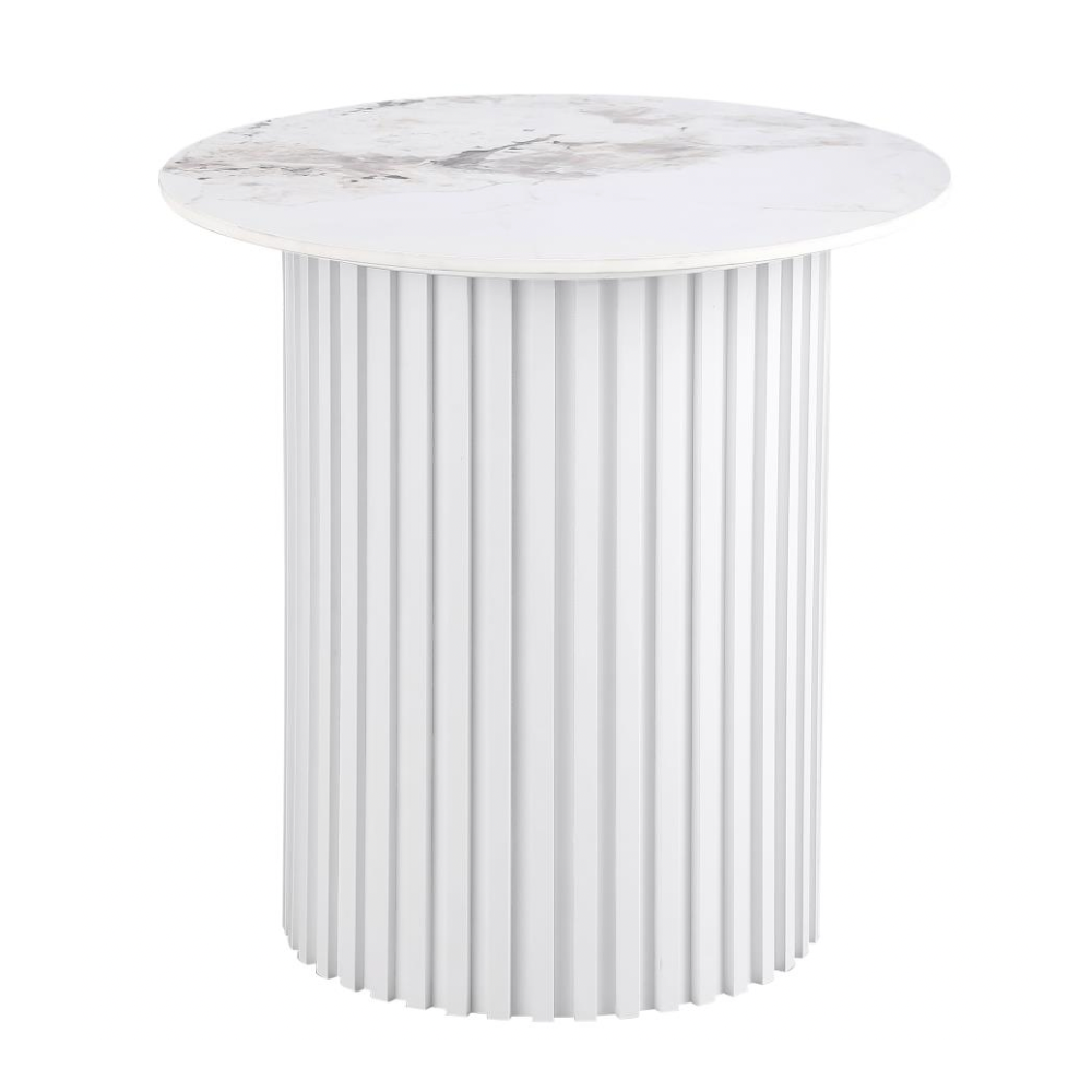 This modern round end table features a sintered stone top with elegant veining and a fluted metal base in a white powder-coated finish. Compact yet sophisticated, it offers lasting durability and stylish functionality for contemporary living spaces.