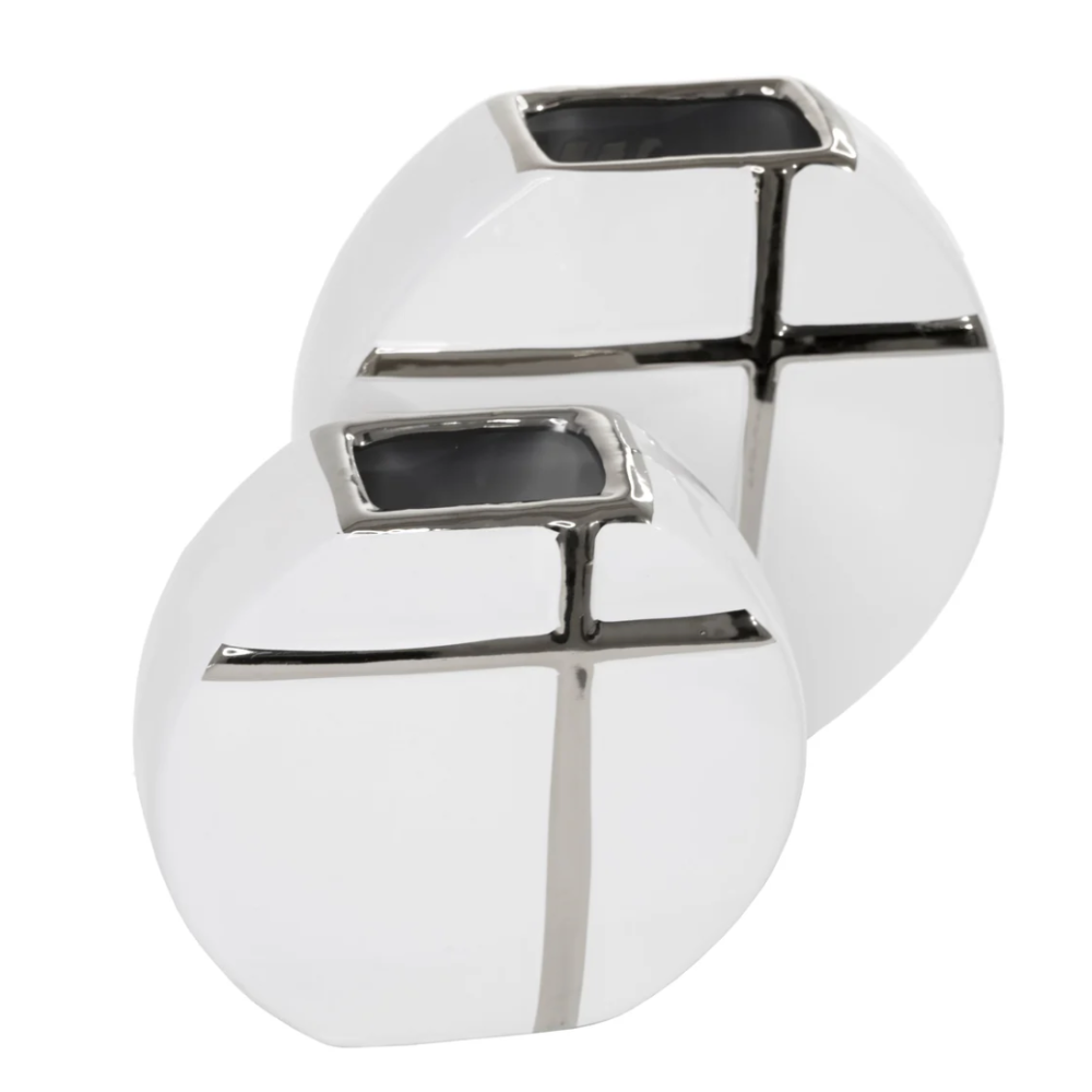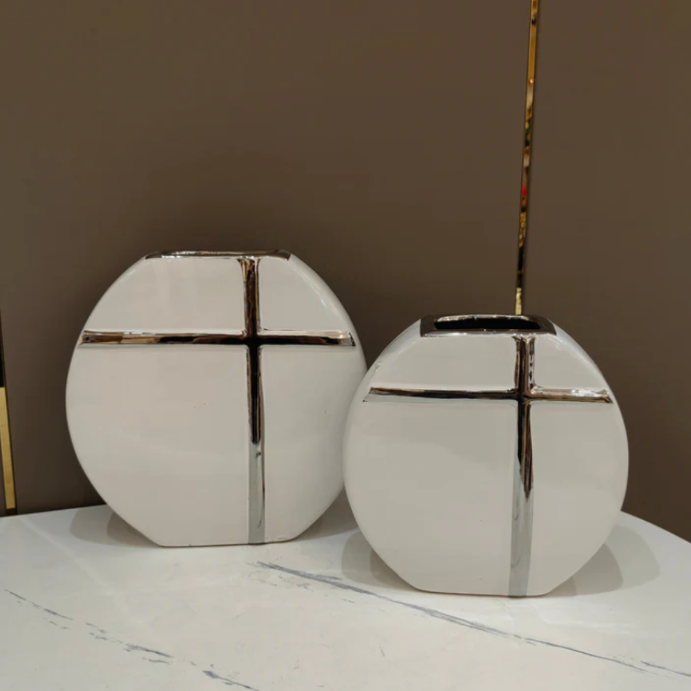 The Decorative Round Modern Vase brings a sleek, contemporary style to your home decor. Featuring a unique cross design and an open top, this vase is perfect for arranging dry flowers or standing alone as a statement piece. Its elegant design adds a modern touch to any room.