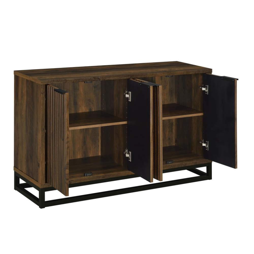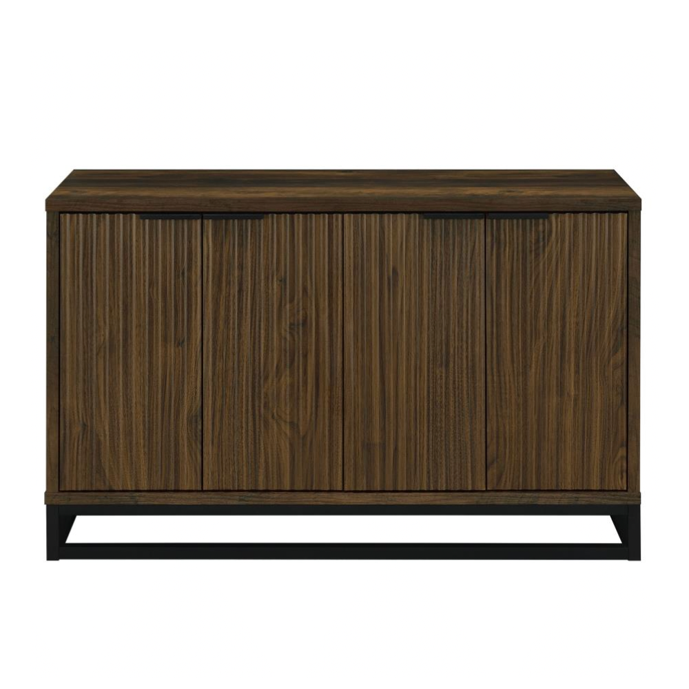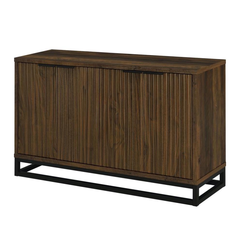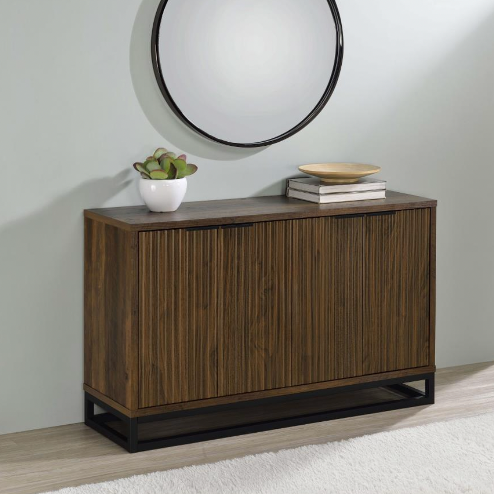 Elevate your space with the bold, modern rustic charm of the Ryatt accent cabinet. Featuring a rich dark pine finish over durable wood products, this cabinet makes a striking statement with its carved, fluted door fronts and strong linear silhouette. The black metal crossbar base adds an industrial edge, enhancing its visual appeal. With four doors revealing two spacious fixed shelves, it offers practical storage wrapped in refined design—perfect for dining rooms, living areas, or entryways.