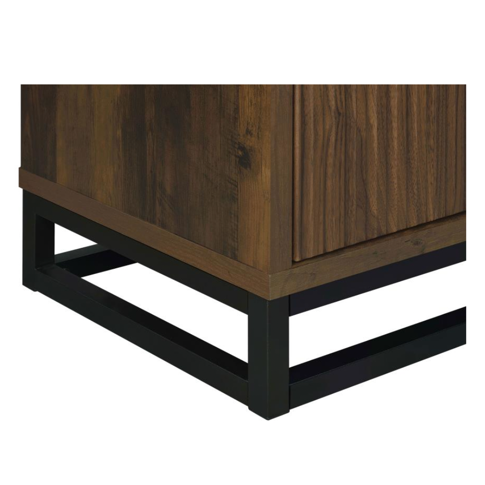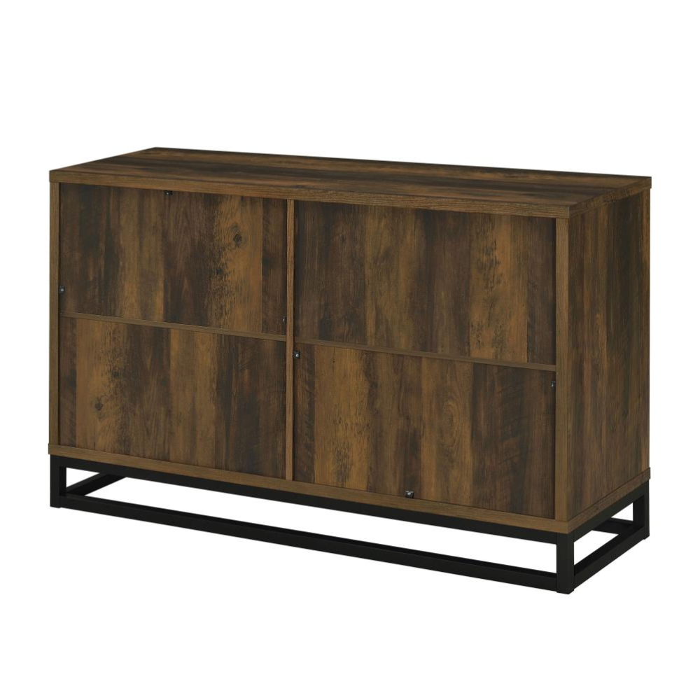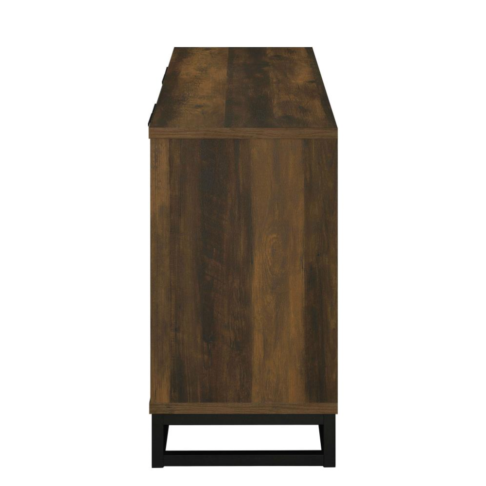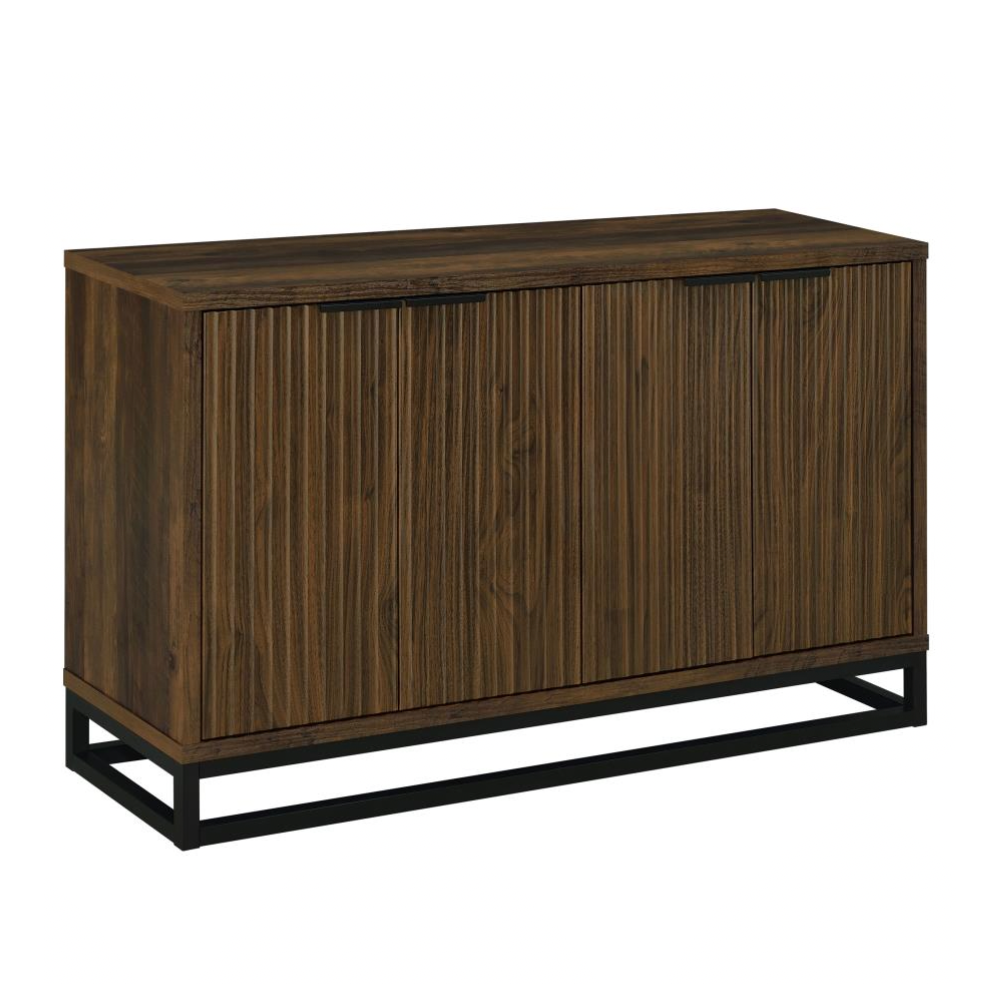 Elevate your space with the bold, modern rustic charm of the Ryatt accent cabinet. Featuring a rich dark pine finish over durable wood products, this cabinet makes a striking statement with its carved, fluted door fronts and strong linear silhouette. The black metal crossbar base adds an industrial edge, enhancing its visual appeal. With four doors revealing two spacious fixed shelves, it offers practical storage wrapped in refined design—perfect for dining rooms, living areas, or entryways.