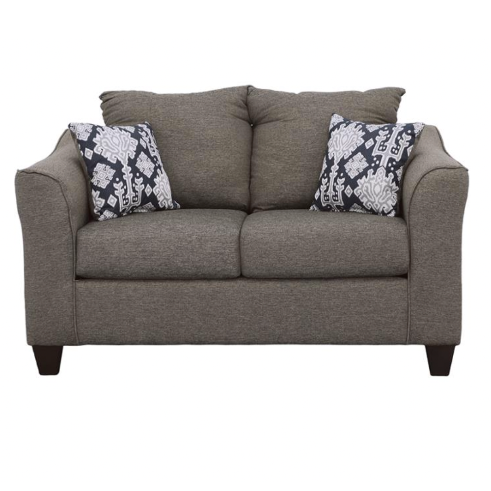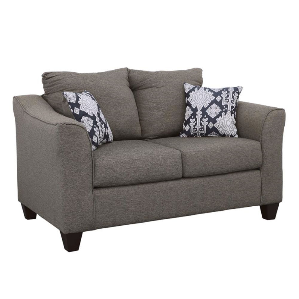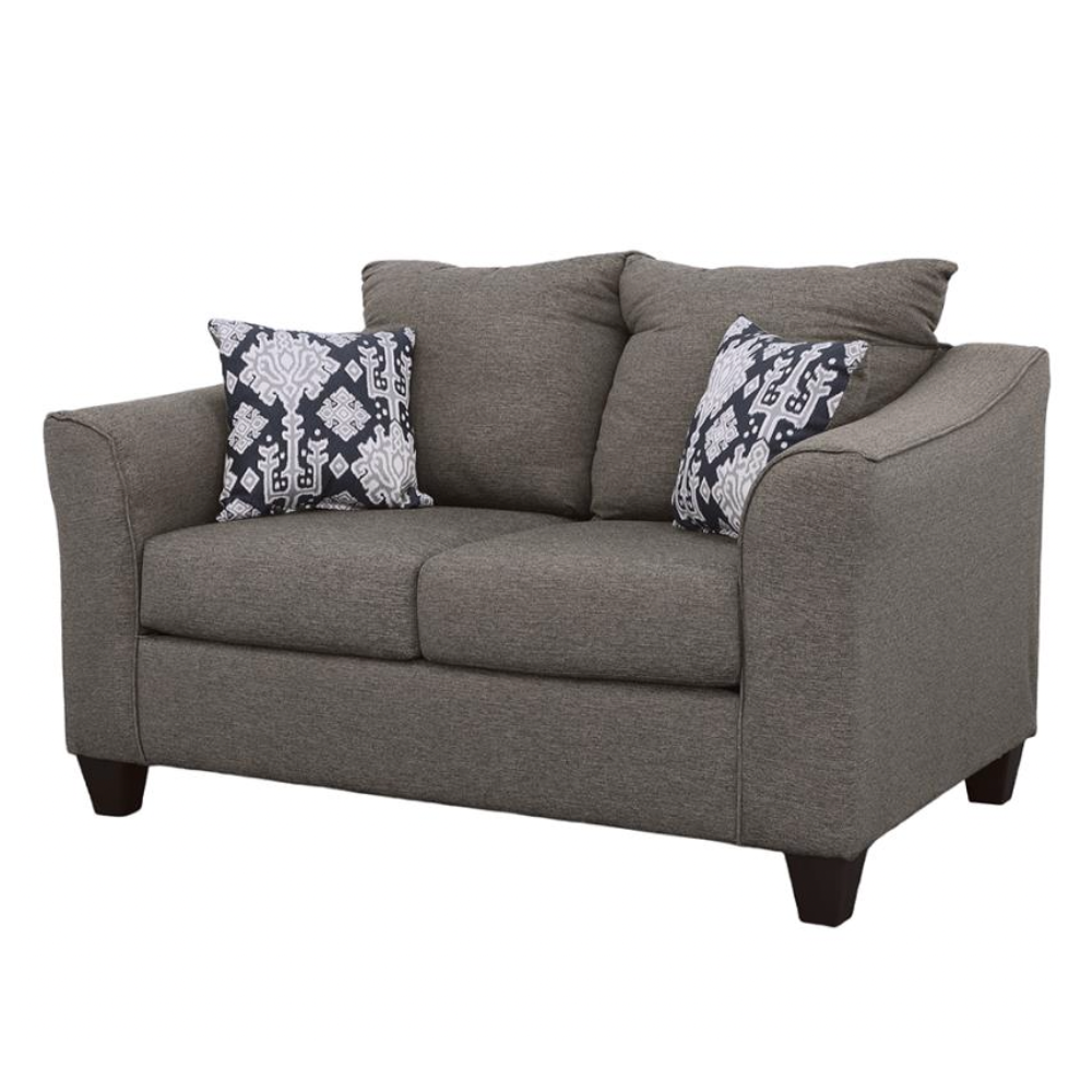 Infuse your living room with understated glamour with this classic loveseat. Its cool, casual design brings a touch of traditional style to any space. The warm, neutral grey upholstery is complemented by contrasting accent pillows, adding a hint of sophistication. Built with a sturdy frame and topped with high-density, full-foam seat cushions, this loveseat offers firm and comfortable support. Pair it with a matching sofa to create a welcoming and inviting atmosphere in your home.