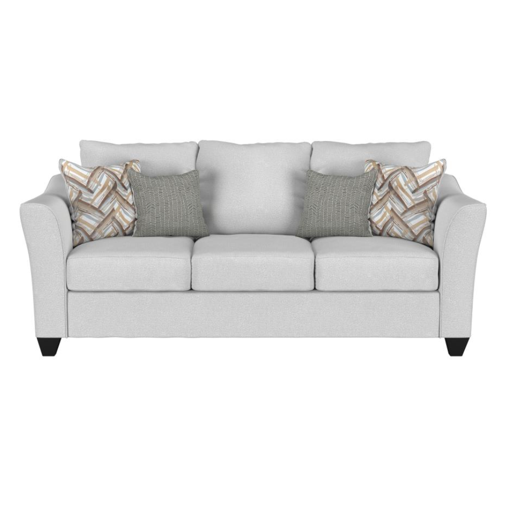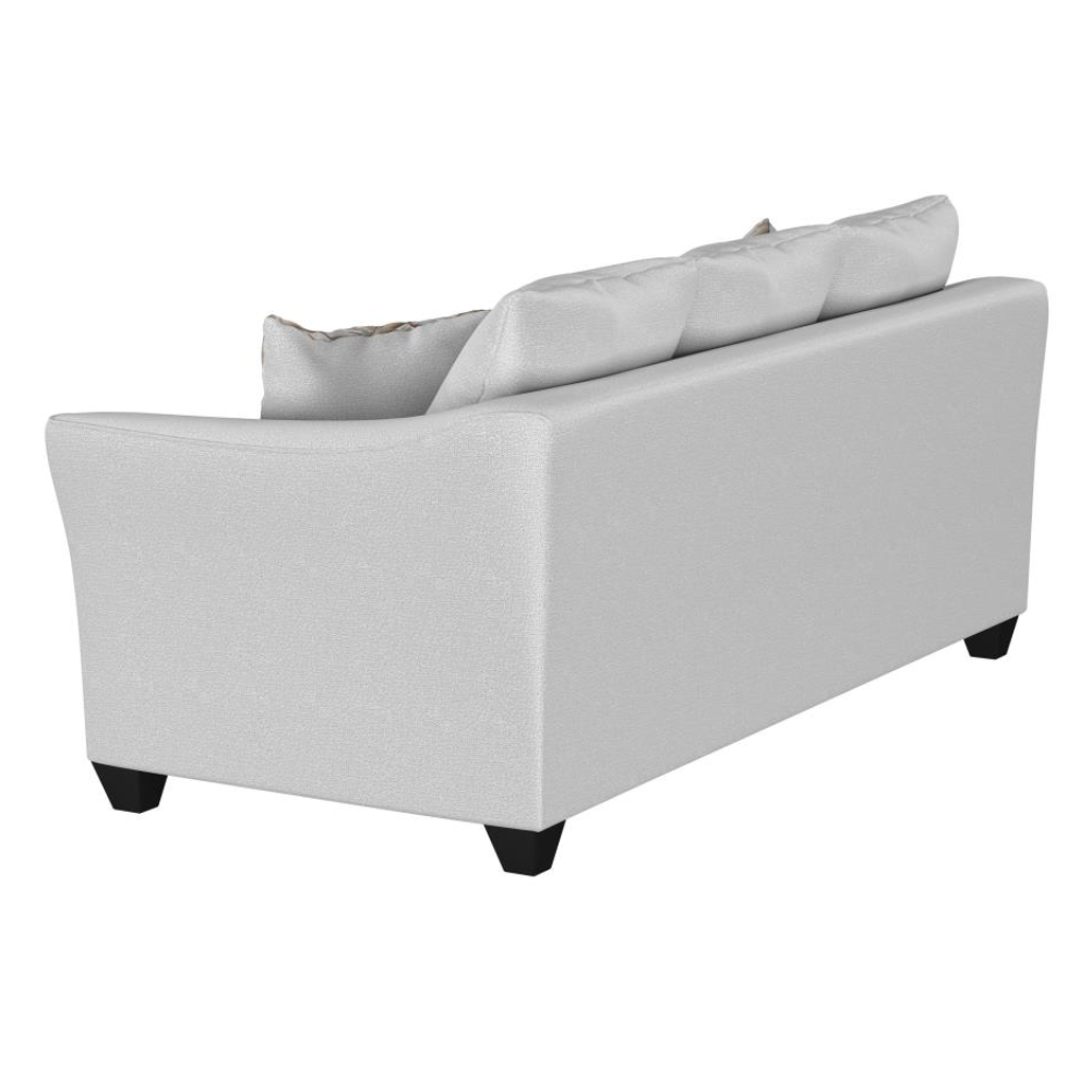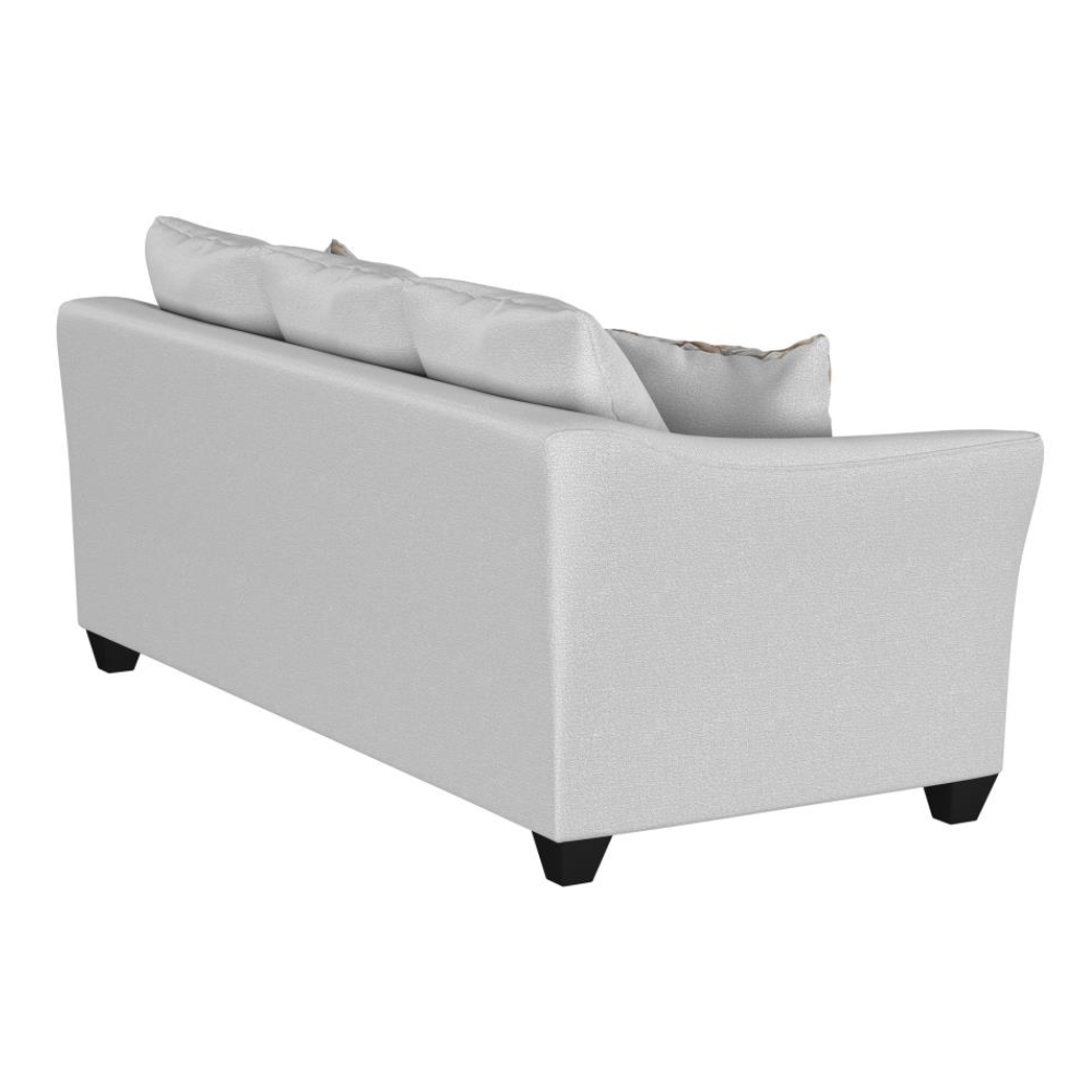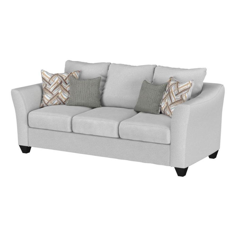 The inviting gray mist upholstery of this modern sofa creates a rich, refined look and feel, perfect for any contemporary living space. Plush foam-filled cushions ensure excellent comfort, while accent pillows add both pattern and personalized support for lounging. The sofa's rounded arms offer a flared, elegant touch, ideal for a refined yet welcoming family room. With attached cushions that maintain a neat appearance and sinuous spring decking under the seats, this sofa provides enduring support and style.