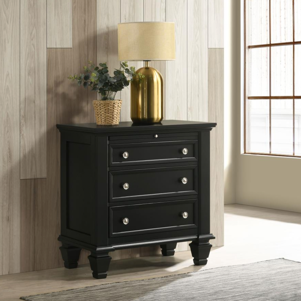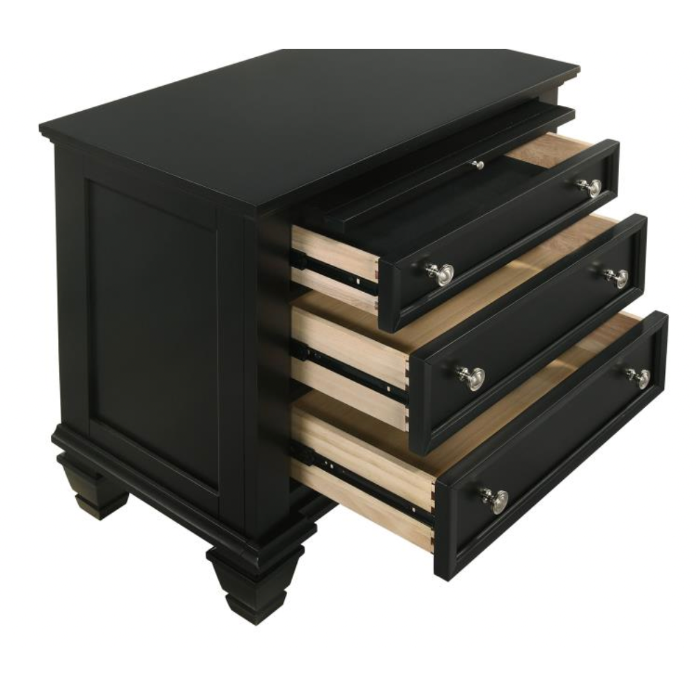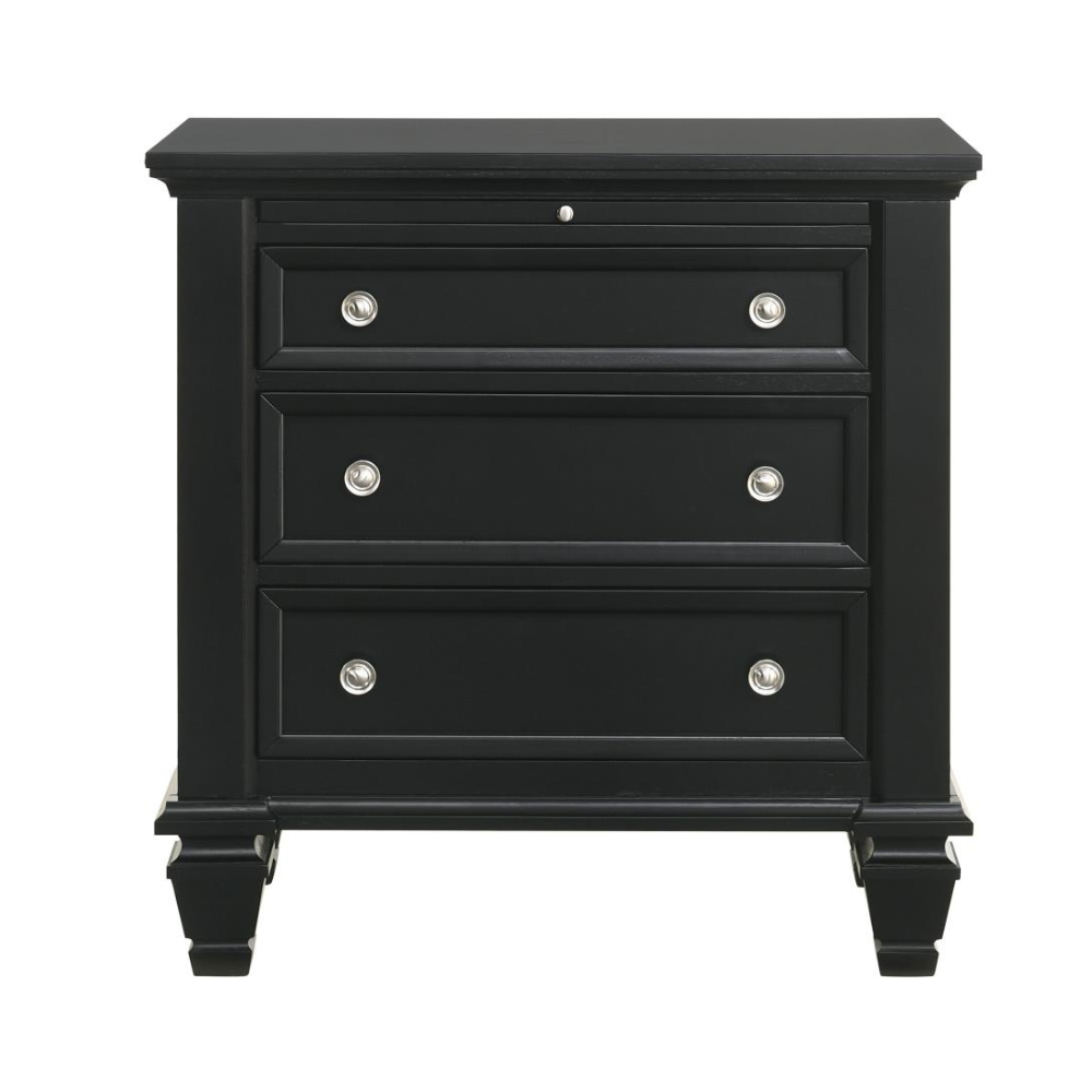 Enhance your bedroom with this elegant nightstand that combines timeless style and practical functionality. Featuring three spacious drawers and a pull-out service tray, it offers ample storage and a convenient surface for late-night essentials. The felt-lined top drawer, brushed nickel hardware, and bold black finish add a sophisticated touch, while the sturdy construction ensures lasting durability.