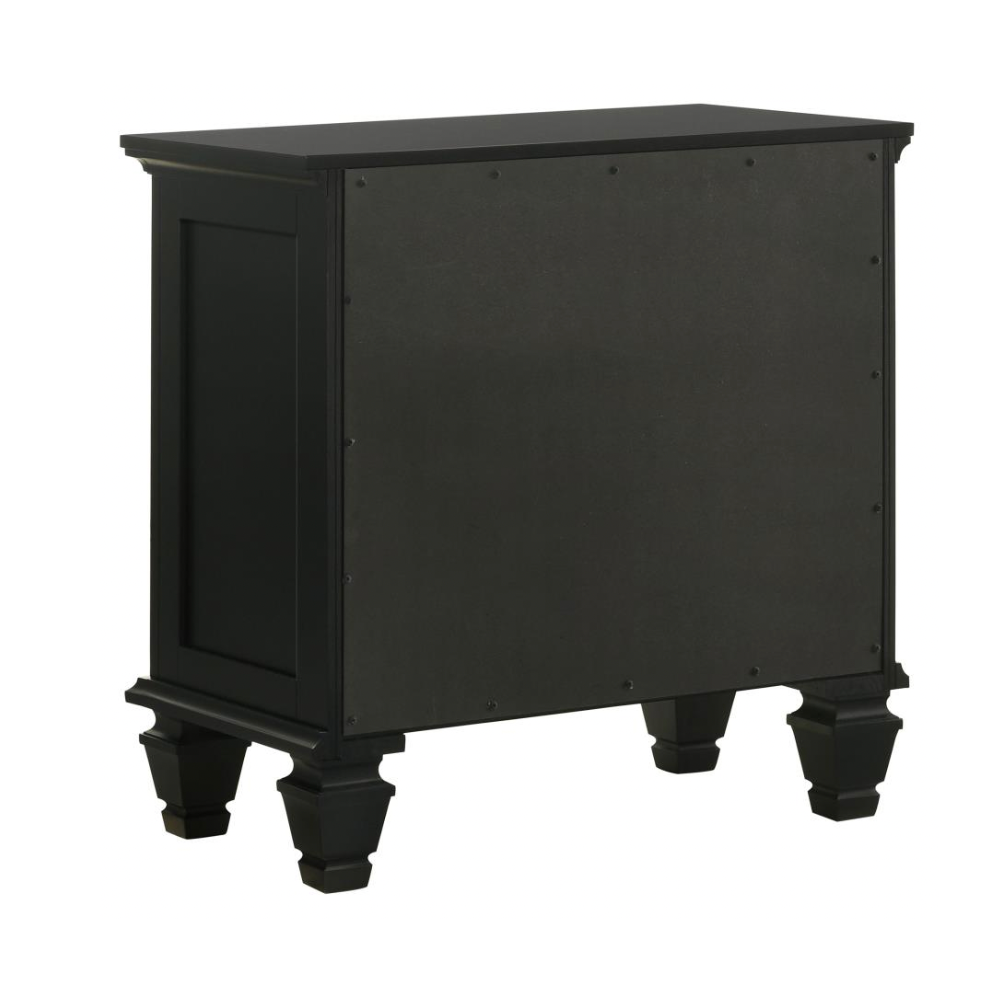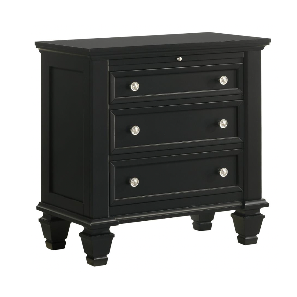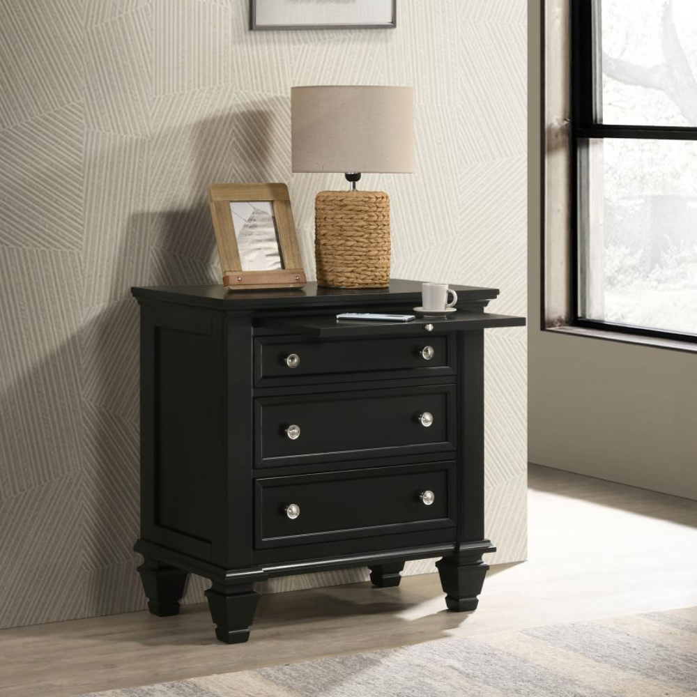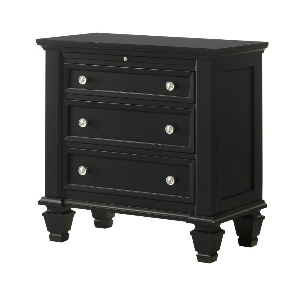 Enhance your bedroom with this elegant nightstand that combines timeless style and practical functionality. Featuring three spacious drawers and a pull-out service tray, it offers ample storage and a convenient surface for late-night essentials. The felt-lined top drawer, brushed nickel hardware, and bold black finish add a sophisticated touch, while the sturdy construction ensures lasting durability.