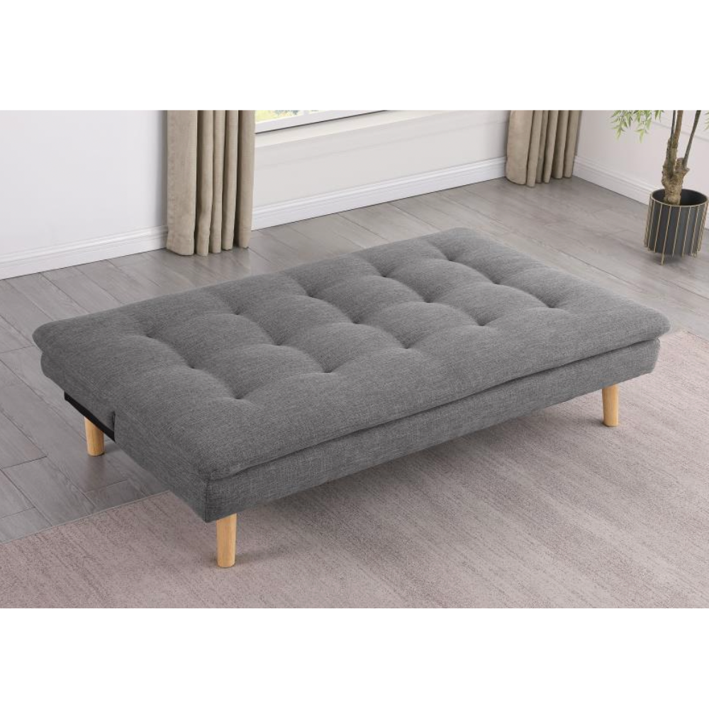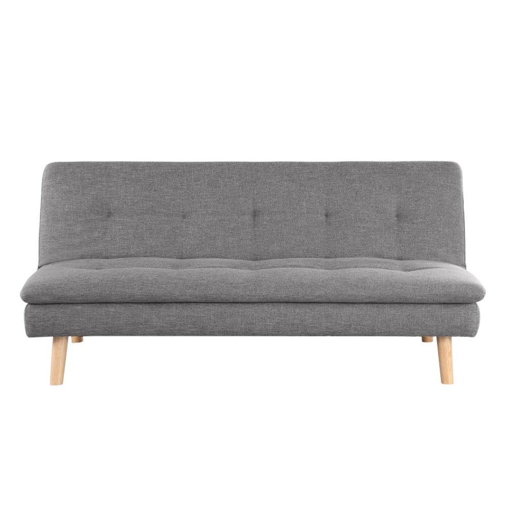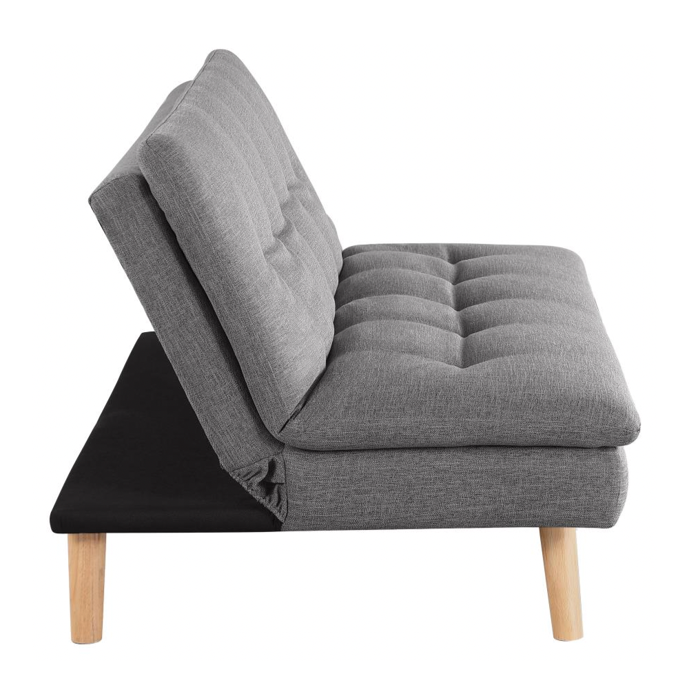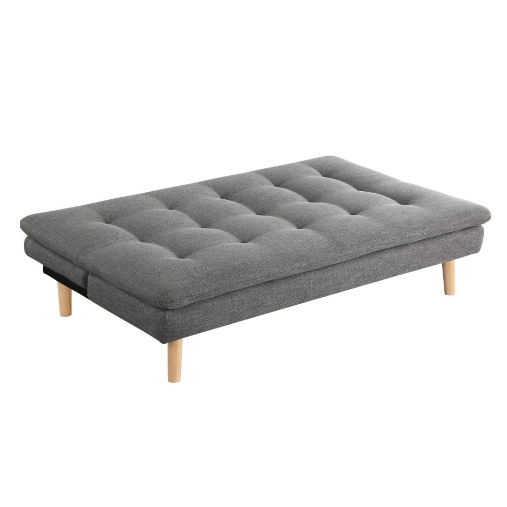 Create maximum flexibility in your space with a modern sofa that folds flat to create a bed when guests spend the night. The sofa is a minimalist design complete with an armless silhouette. It's upholstered in a medium gray, offering chic style in a den or home office. Its foam cushions are gently tufted to add depth and texture. The sofa rests on tapered, splayed legs with a natural wood finish, adding a light, airy final touch.