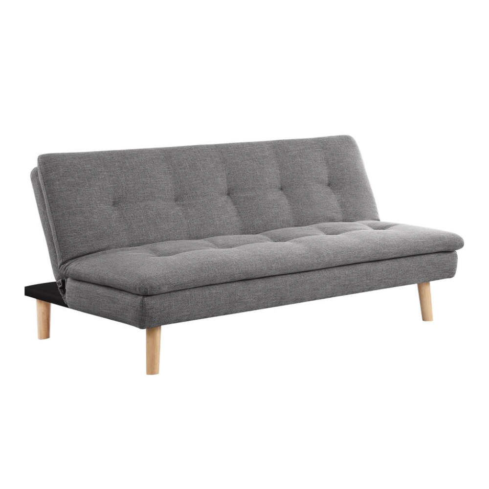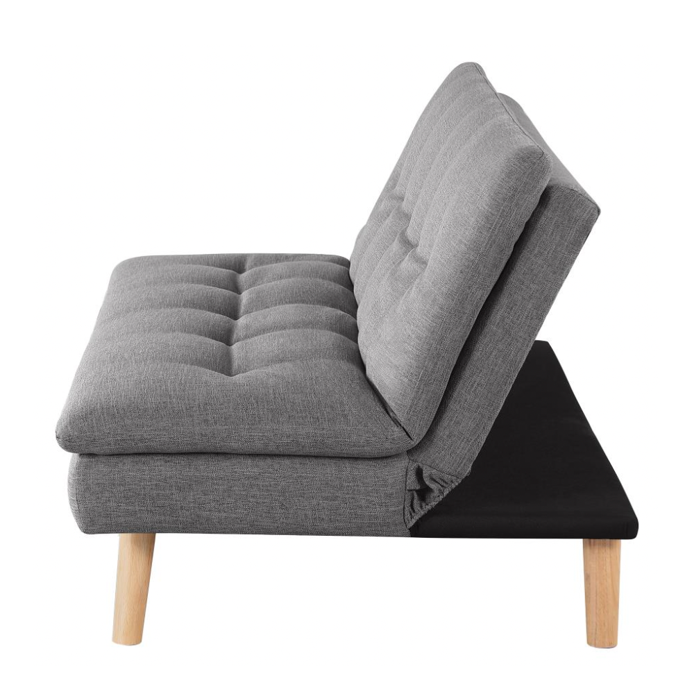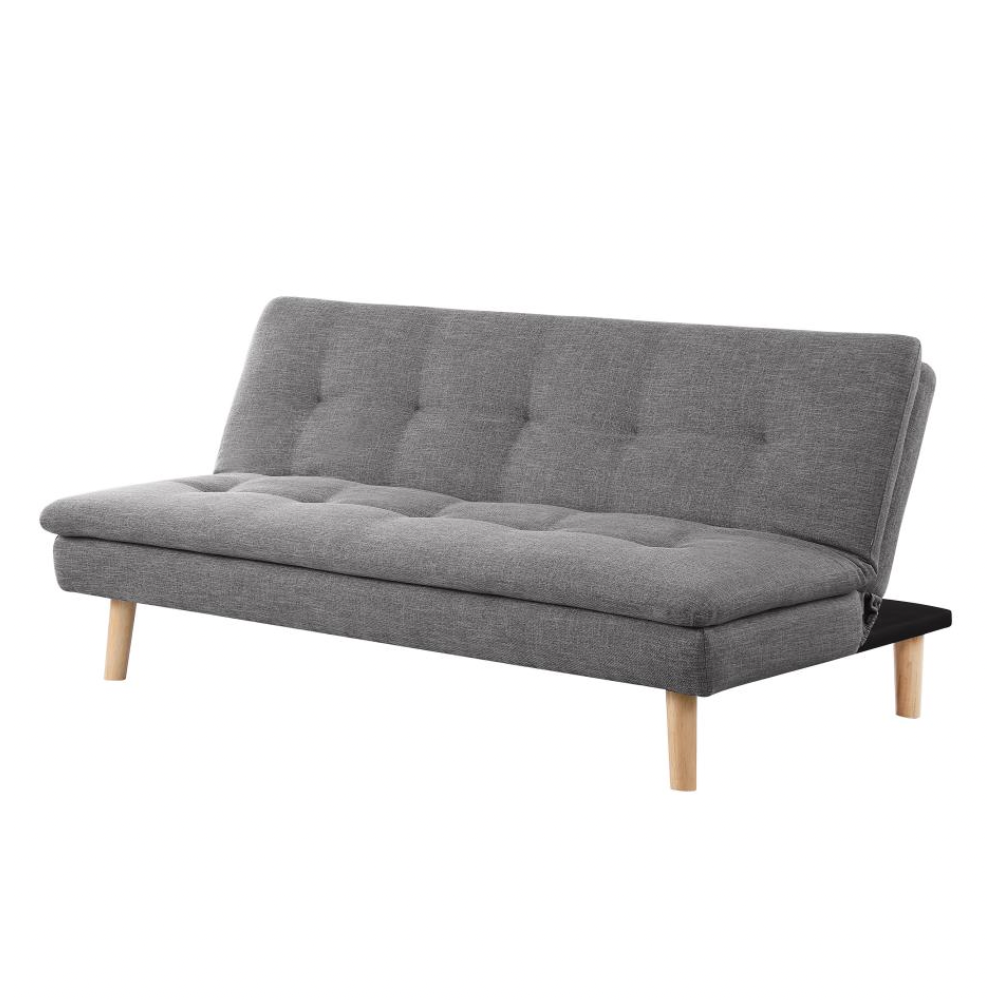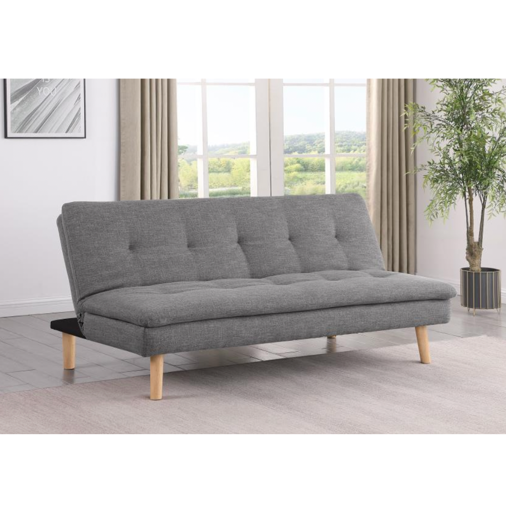 Create maximum flexibility in your space with a modern sofa that folds flat to create a bed when guests spend the night. The sofa is a minimalist design complete with an armless silhouette. It's upholstered in a medium gray, offering chic style in a den or home office. Its foam cushions are gently tufted to add depth and texture. The sofa rests on tapered, splayed legs with a natural wood finish, adding a light, airy final touch.