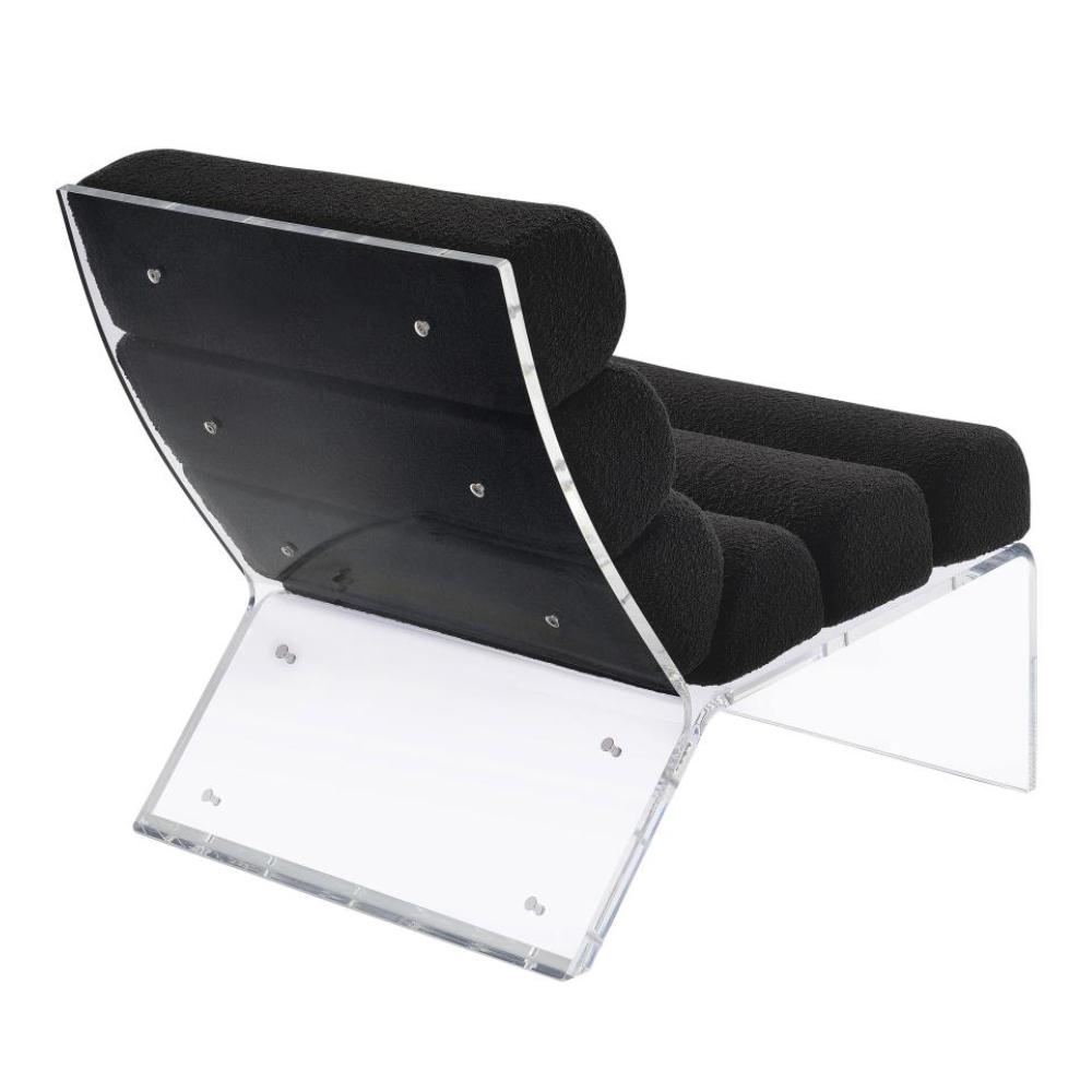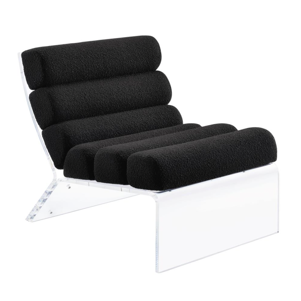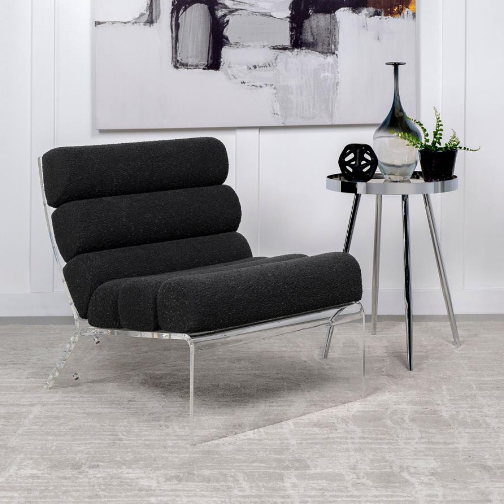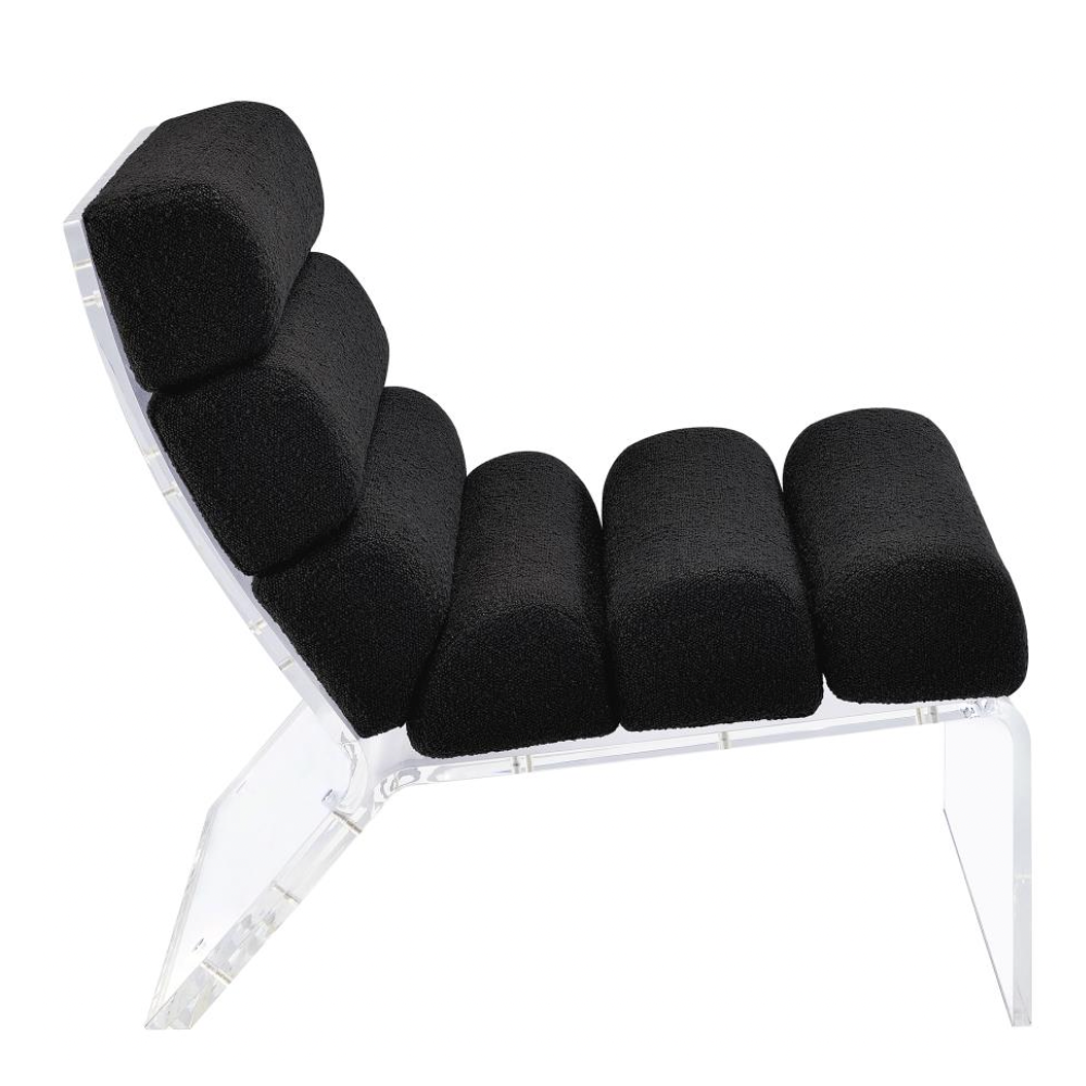 Indulge in the perfect blend of contemporary design and luxurious comfort with this stunning accent lounge chair. Highlighted by horizontal channel tufting, its plush bouclé fabric upholstery creates a textured and inviting feel. A thick, high-quality clear acrylic frame surrounds the chair, offering both durability and a modern floating effect. This sophisticated design effortlessly blends into any décor, becoming a striking centerpiece that elevates your living space. With its plush comfort and sleek transparency, this chair is a statement in modern elegance.