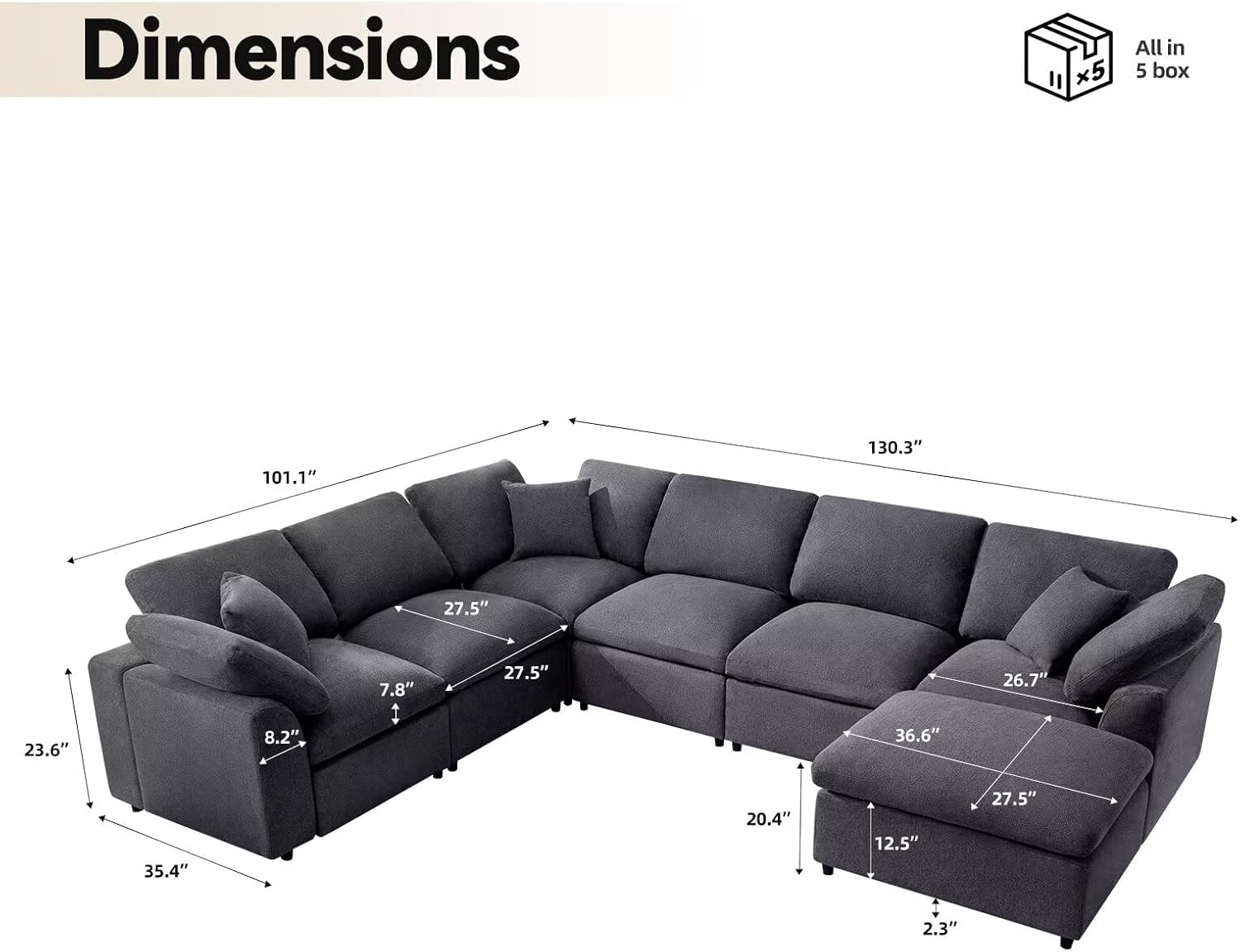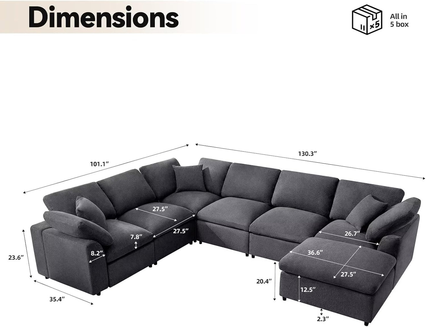 - Product Dimensions: 27.5"D x 130.3"W x 23.6"H