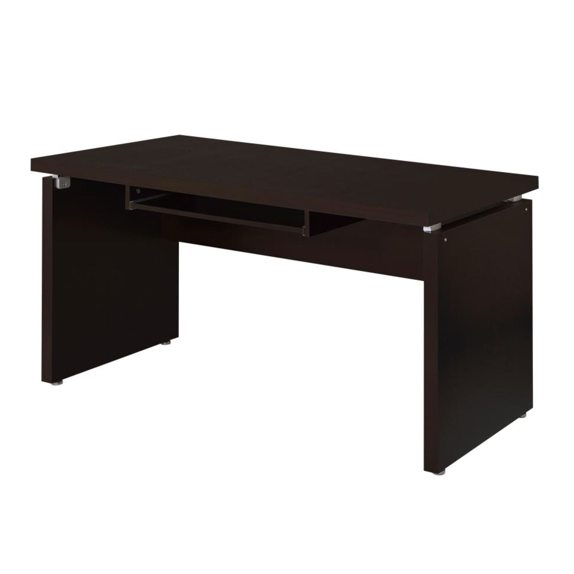 Elevate your study or workspace with our sophisticated Computer Desk, designed to bring class and convenience to any setting. Crafted with sleek lines and sturdy construction, this desk is built to enhance the ambiance of your home or office. The rich cappuccino finish adds depth to its appearance, while the floating surface design adds character, creating a modern and stylish aesthetic. Complete with eye-catching metal hardware featuring a shining silver finish, this desk exudes elegance and sophistication, making it a standout piece in any environment.