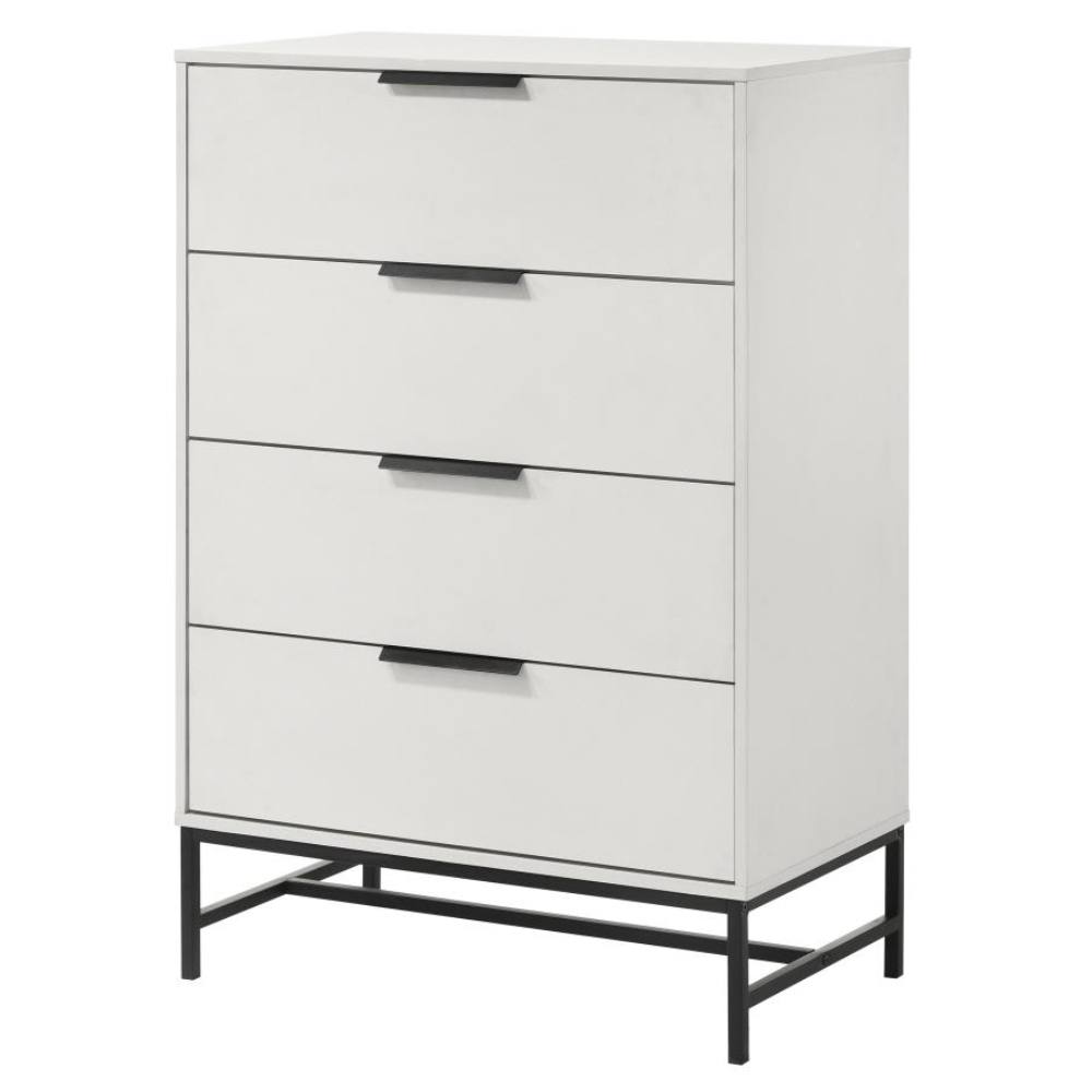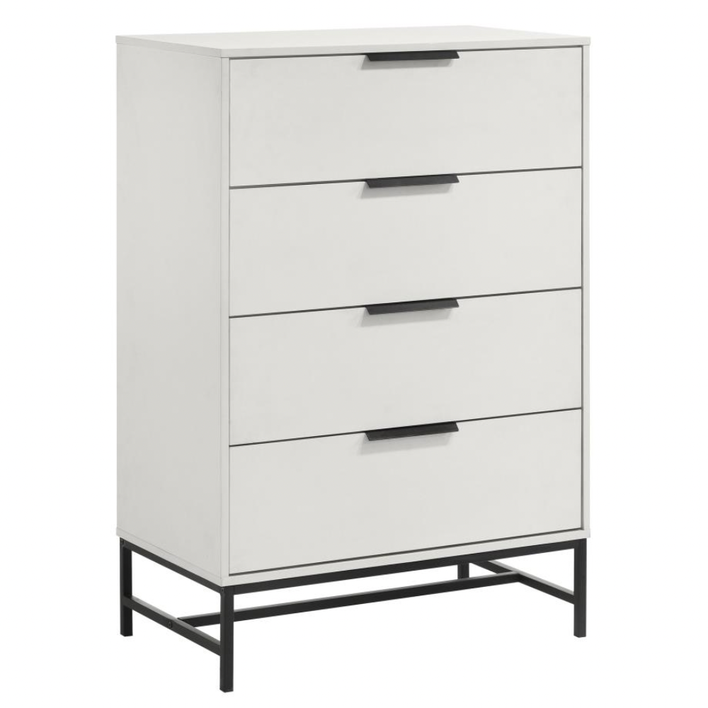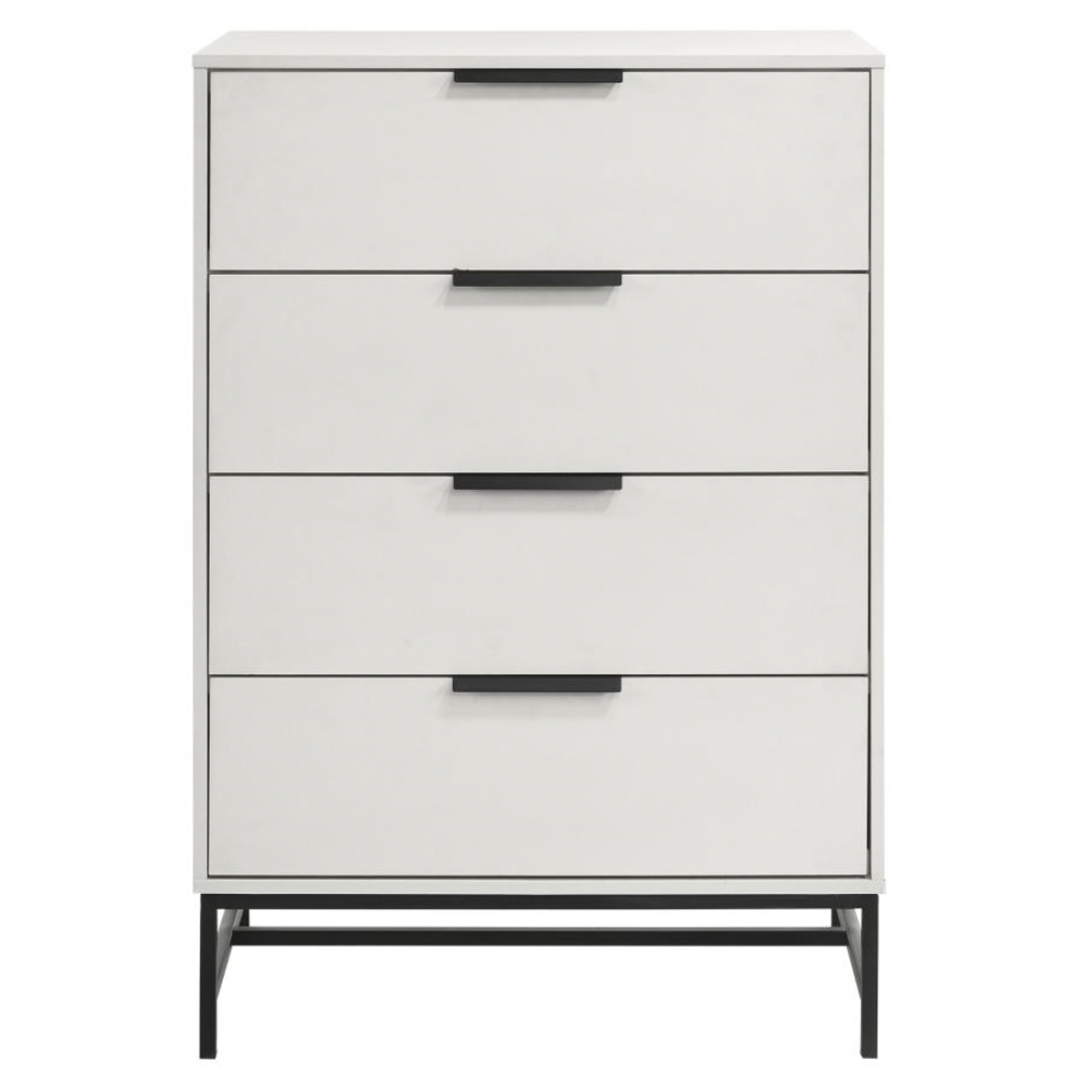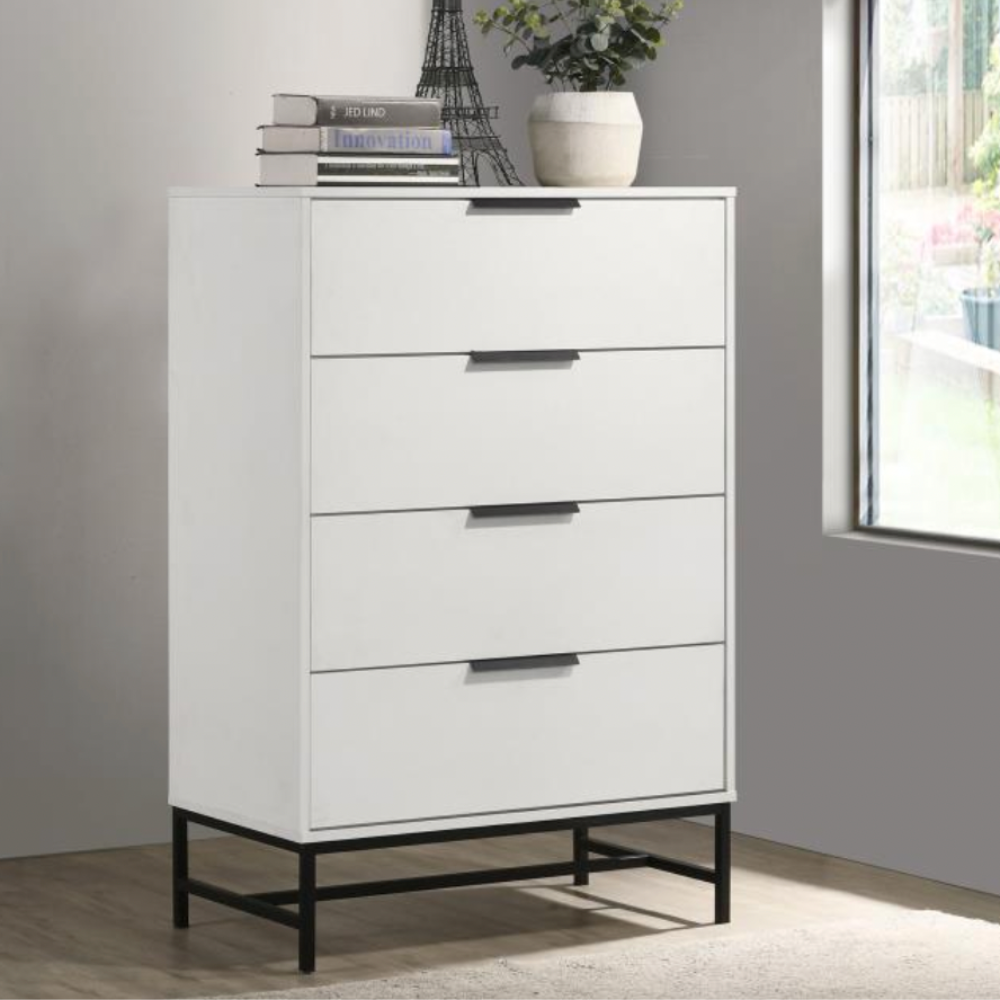 Maximize storage with the compact and modern design of this four-drawer chest. Perfect for organizing clothing, linens, and accessories, this chest combines functionality with style. The crisp white finish and clean lines are enhanced by contrasting black hardware and a matching metal base, creating a light, airy look. The top surface is ideal for displaying personal decor or a jewelry box.