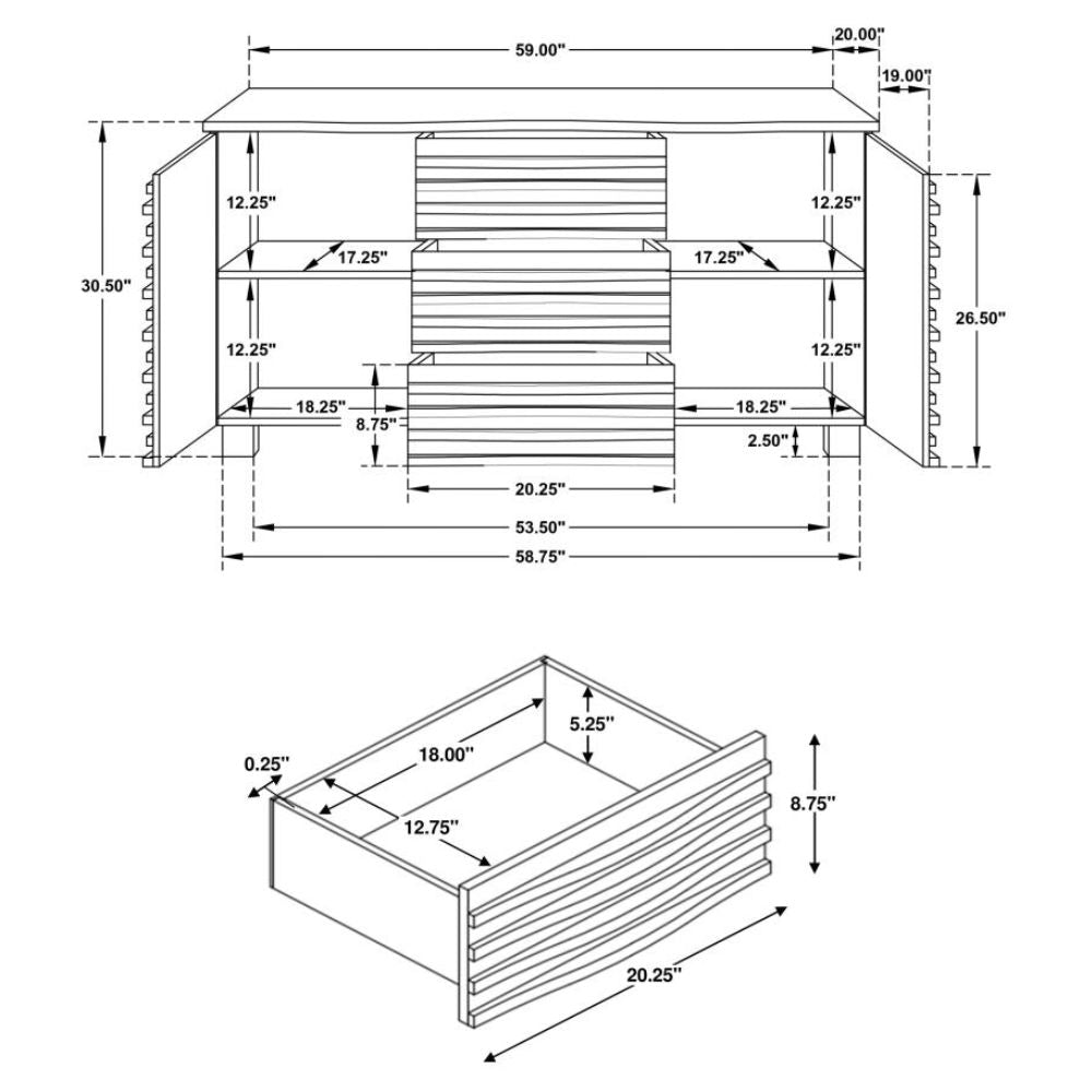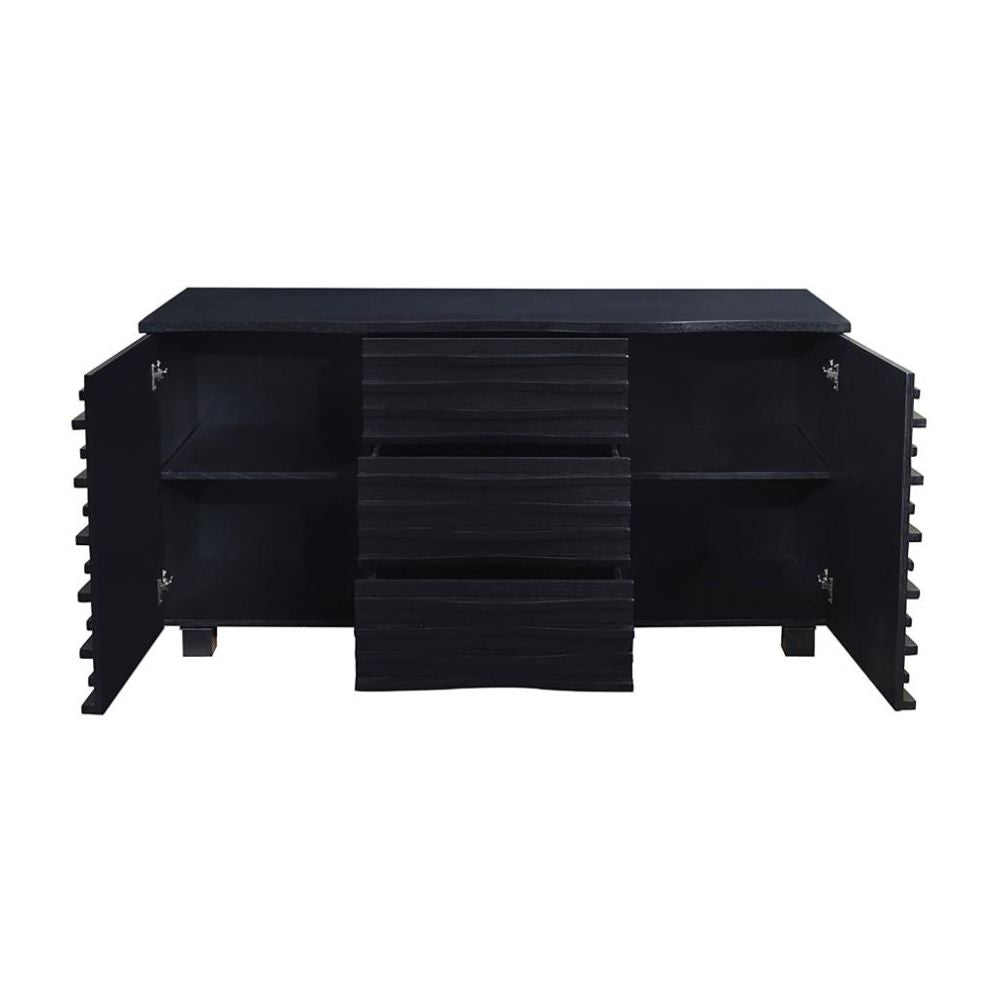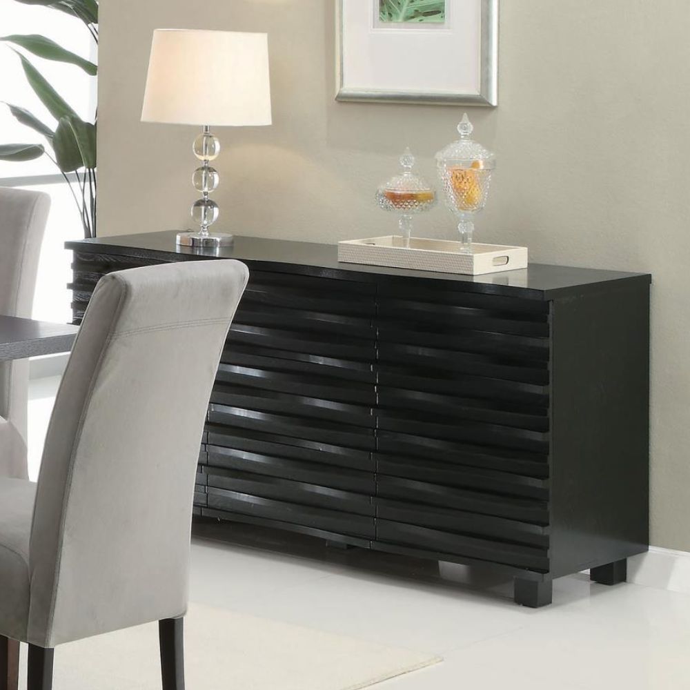 As part of the Stanton Collection, this server brings a fresh look to any casual dining room. Its black finish is rich and bold. The server features plenty of shelves for ample storage of your plates and silverware. It is sturdily constructed and has sufficient space on top for a vase of flowers and several bottles of wine. This server is a fitting complement to the dining table in the same collection, mimicking the layered wave design from the table base.