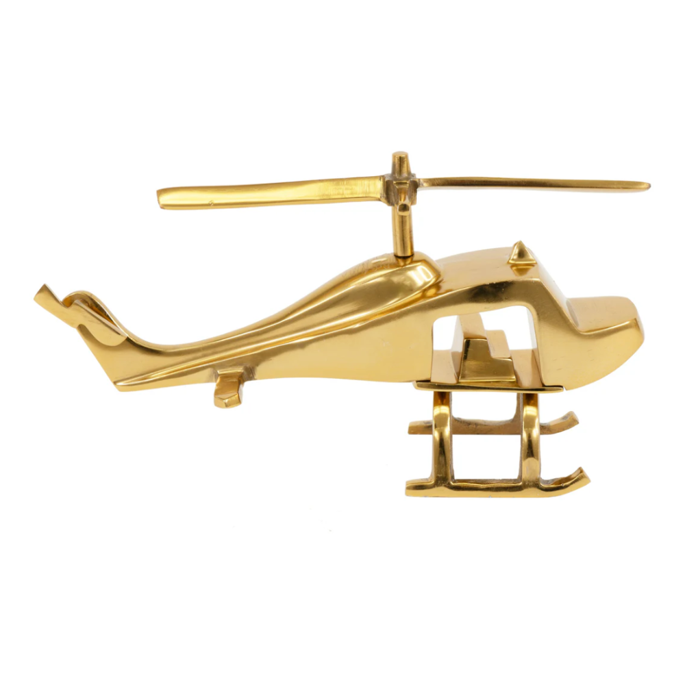 Add an elegant touch to your decor with this modern metal tabletop helicopter sculpture. Its sleek design and smooth finish complement contemporary interiors, making it an eye-catching addition to any room. Crafted with high-quality materials, this helicopter sculpture offers durability and timeless appeal. Perfect for aviation enthusiasts or anyone looking to bring a unique conversation piece into their home or office.
