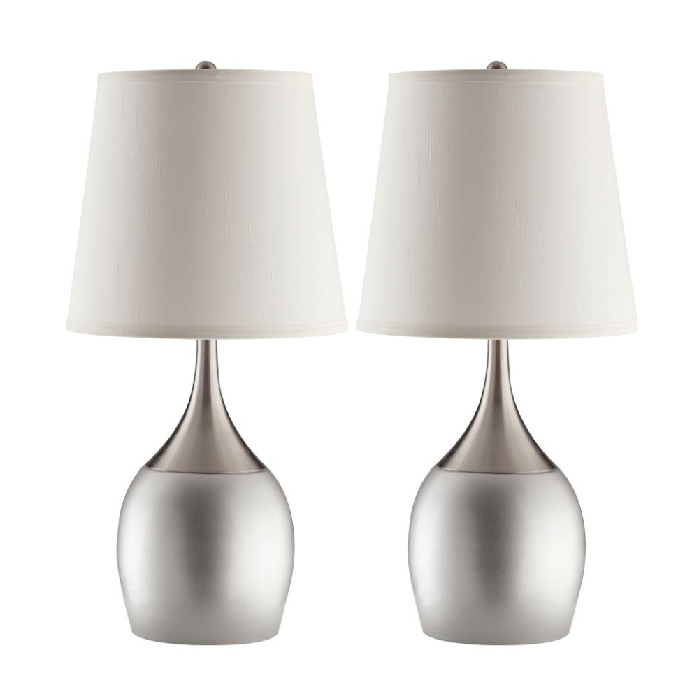 Add symmetry and style to your space with this elegant set of modern table lamps. Featuring gracefully curved urn-style bases with a sleek brushed silver finish, these lamps bring a touch of sophistication to any room. The classic empire shades in clean white fabric gently diffuse light, creating a warm, inviting ambiance. Designed for both beauty and function, this pair is perfect for flanking beds, sofas, or entryway consoles in contemporary or transitional interiors.