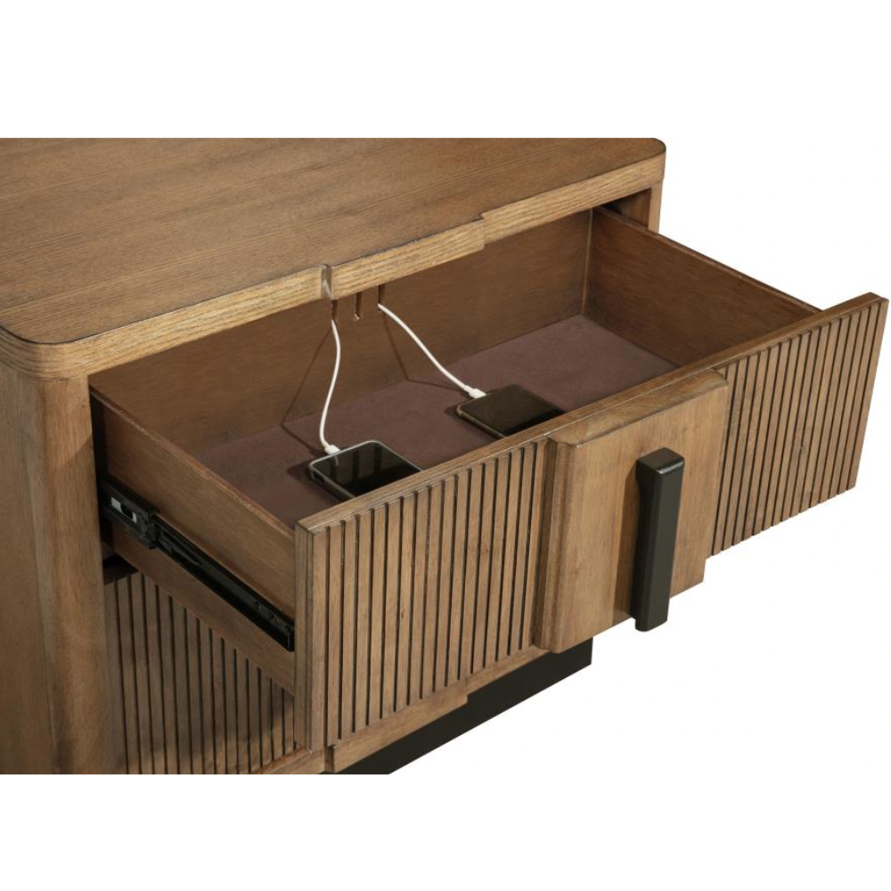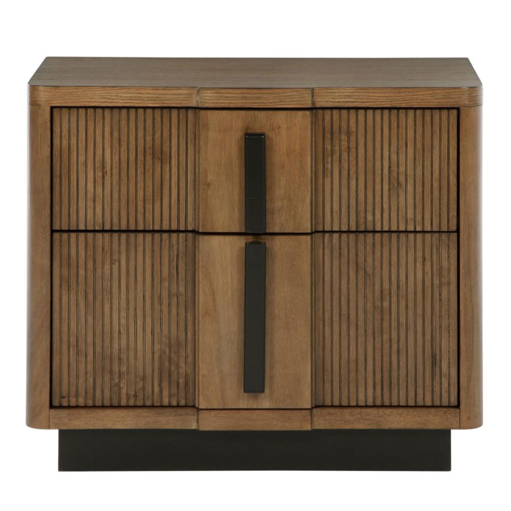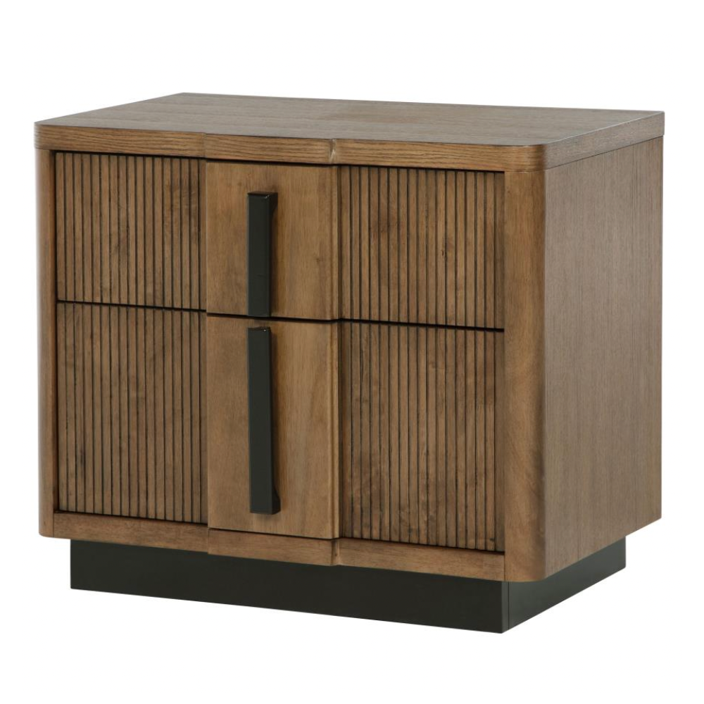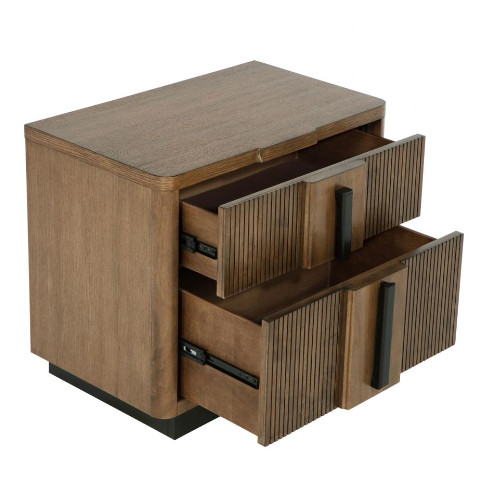Introduce both sophistication and utility to your bedroom with this modern two-drawer nightstand. Showcasing a cool ash brown wood grain finish, it’s enhanced by vertical fluted drawer fronts and rich dark hardware that adds visual depth. The generous top surface provides space for your bedside lamp or décor, while metal extension glides ensure the drawers operate smoothly.