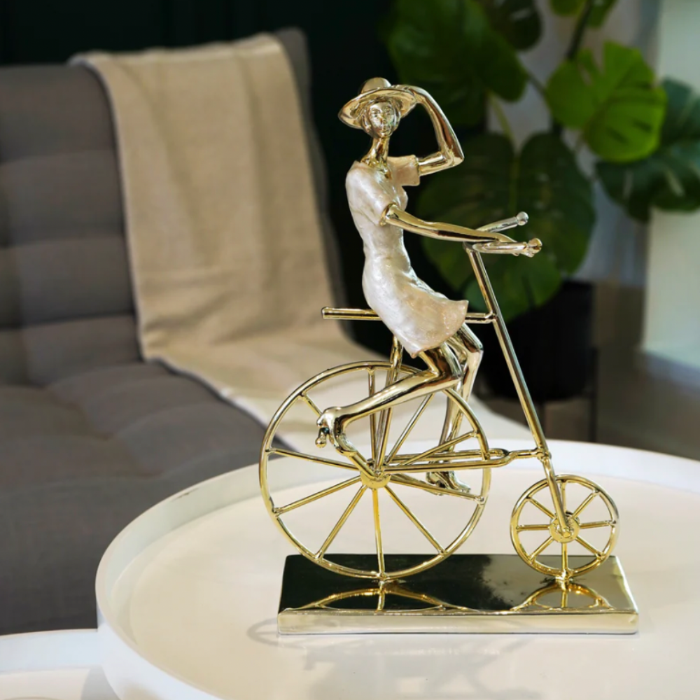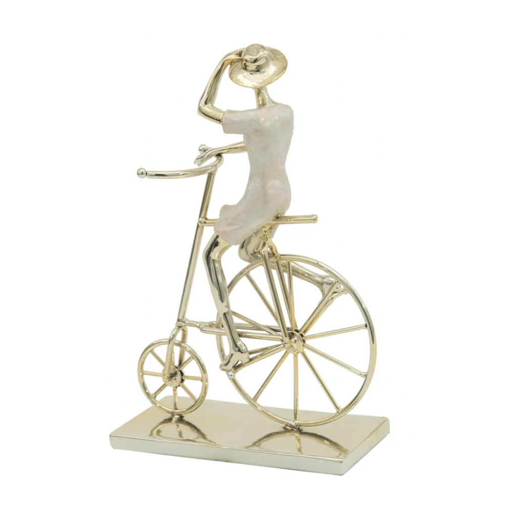 Elevate your home decor with this Charming Woman on Bicycle Sculpture—a delightful accent piece perfect for any corner, entryway, or tabletop in your living room, bedroom, or office. This sculpture captures the timeless elegance of a woman taking a stroll on a bicycle, blending simplicity with a whimsical touch that adds personality to any space.