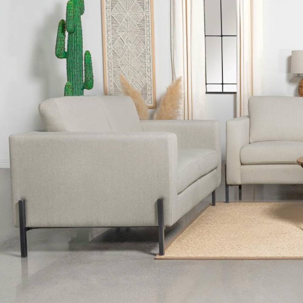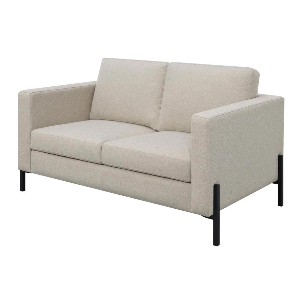 Elevate your space with this impeccably tailored modern loveseat, featuring clean lines and sophisticated details. Subtle herringbone fabric and sleek black metal legs create a refined, contemporary look. Pocket coil seating ensures lasting comfort and support, making this a stylish and functional centerpiece.