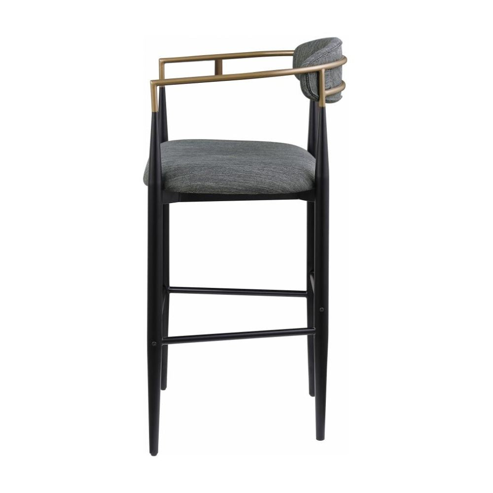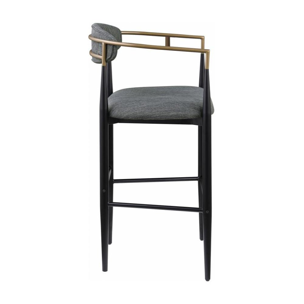 Take your kitchen or dining room decor to stylish new heights with the mid-century flair of a set of two modern barstools. Each offers an airy, open silhouette with its pairing of a plush seat and slender backrest, both with foam cushioning and stylish upholstery. The gentle curvature of the seatback continues in slim arms that receive a gold finish, complementing both the fabric and the black finish of the base. The base of each barstool features tapering legs and slim support bars that create a built-in footrest for added comfort and support. This plush barstool is the ideal solution for a bar table in a relaxed dining room or a home lounge in need of elevated style.