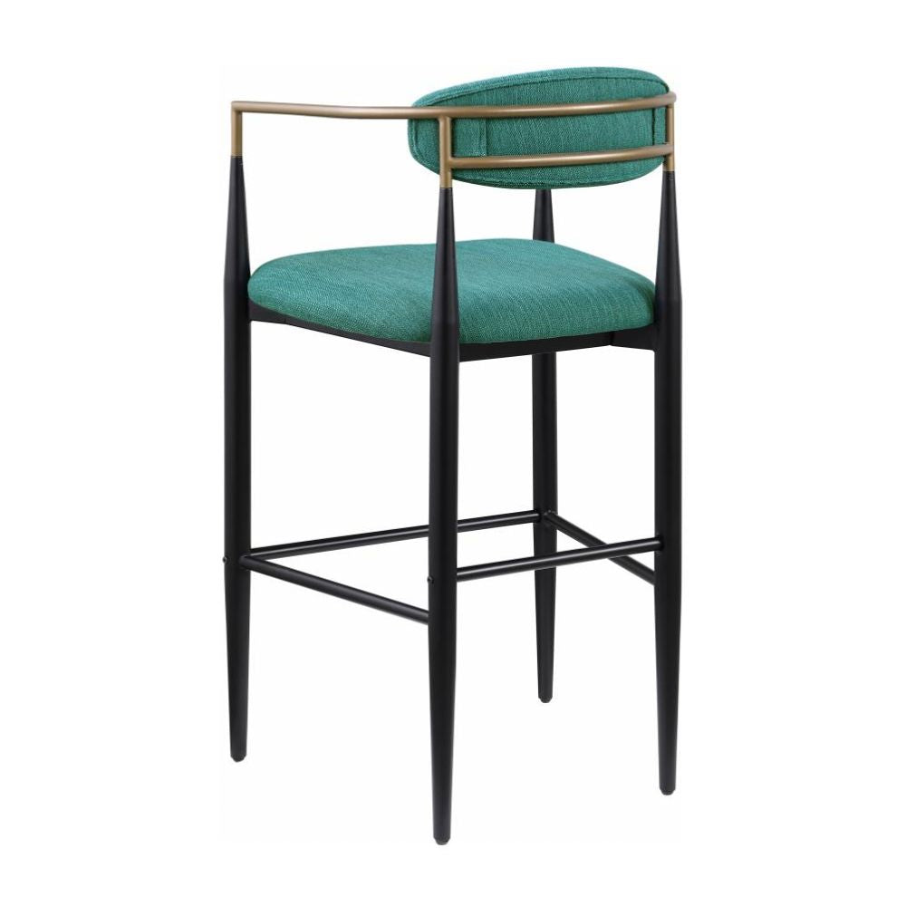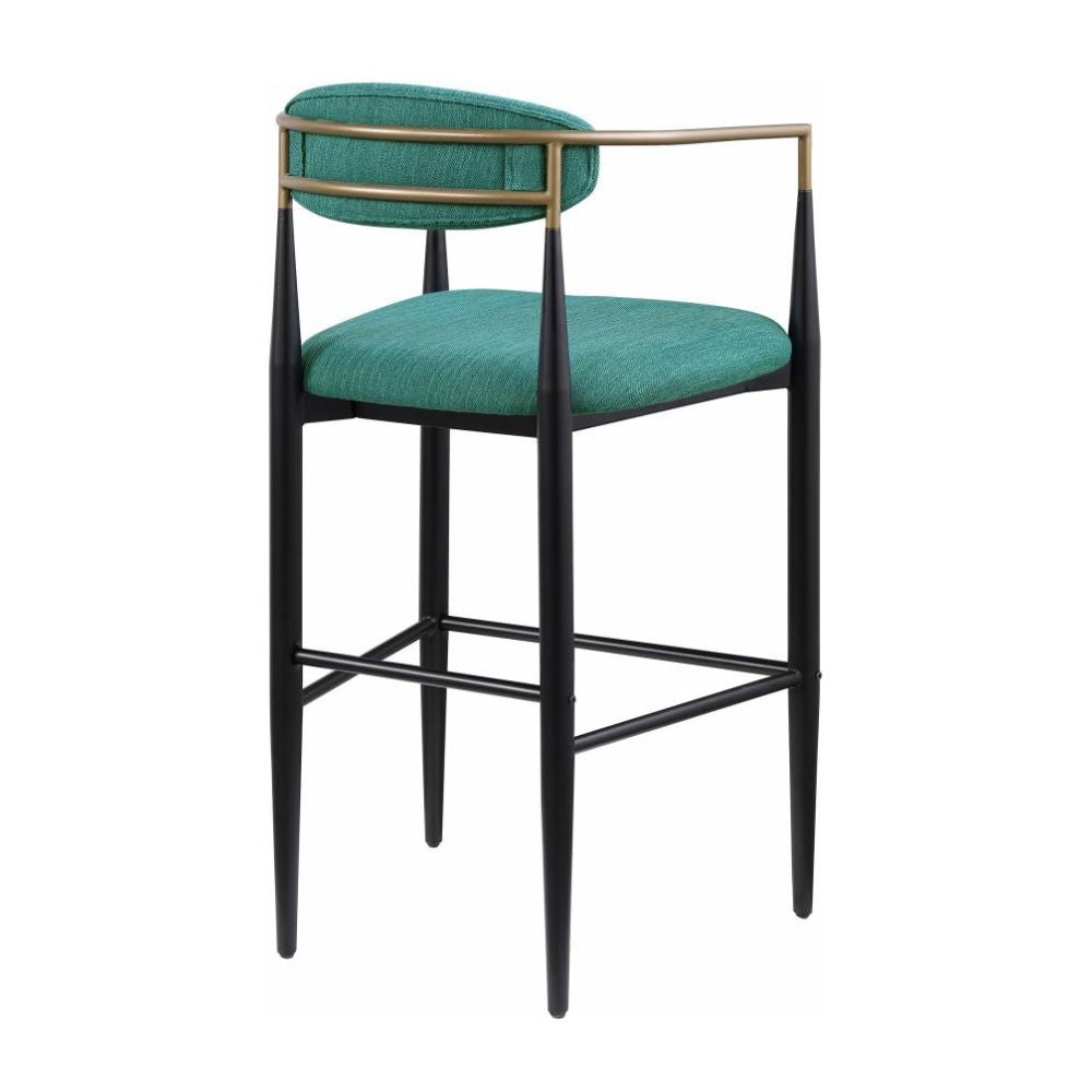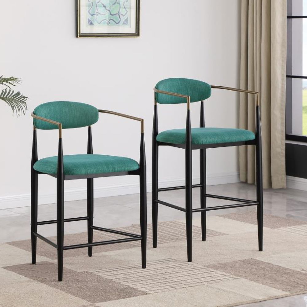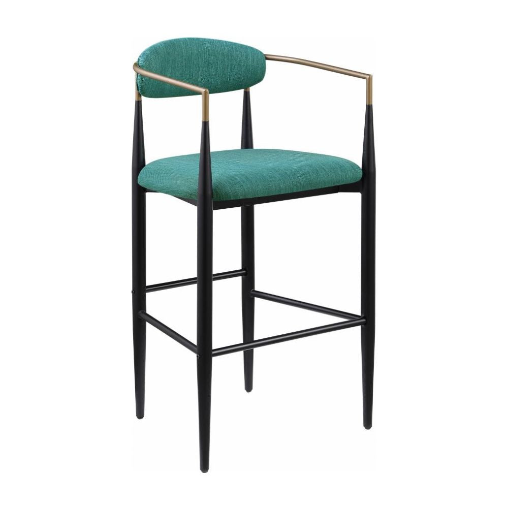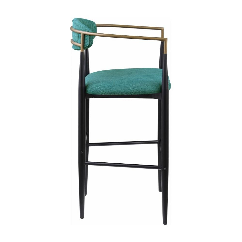 Take your kitchen or dining room decor to stylish new heights with the mid-century flair of a set of two modern barstools. Each offers an airy, open silhouette with its pairing of a plush seat and slender backrest, both with foam cushioning and stylish upholstery. The gentle curvature of the seatback continues in slim arms that receive a gold finish, complementing both the fabric and the black finish of the base. The base of each barstool features tapering legs and slim support bars that create a built-in footrest for added comfort and support. This plush barstool is the ideal solution for a bar table in a relaxed dining room or a home lounge in need of elevated style.