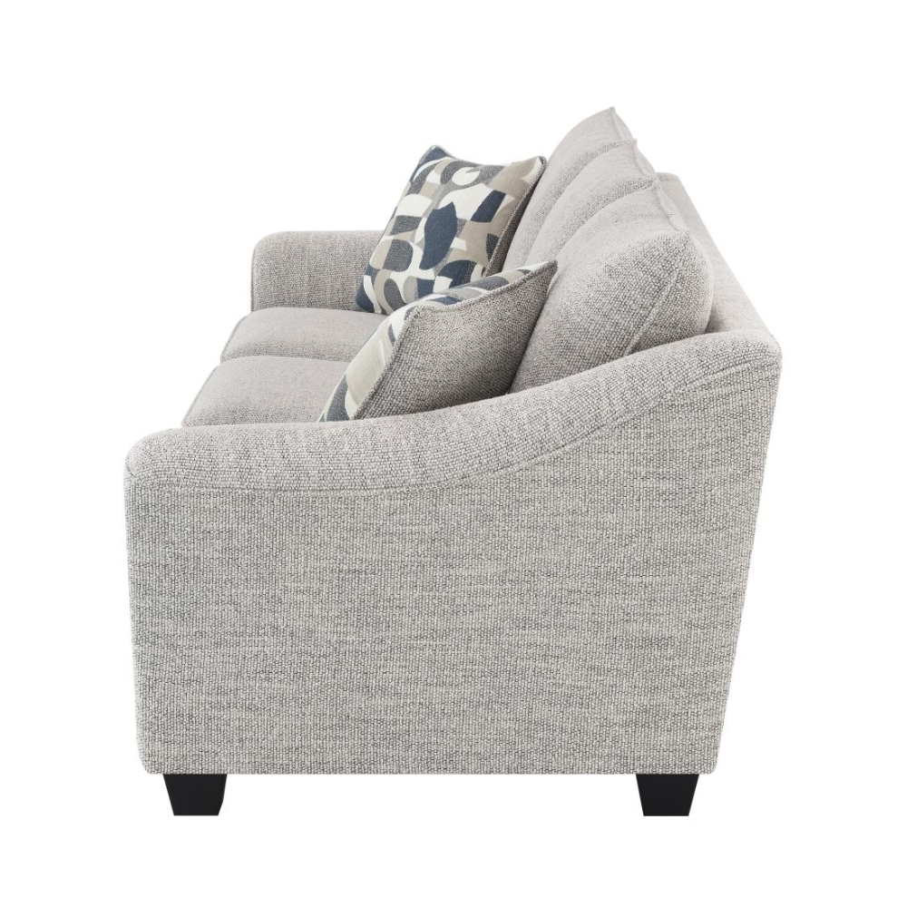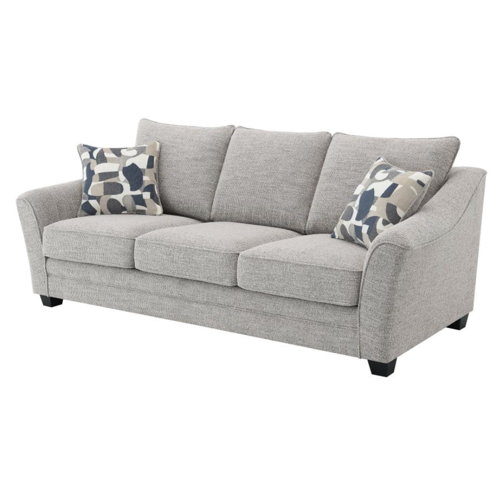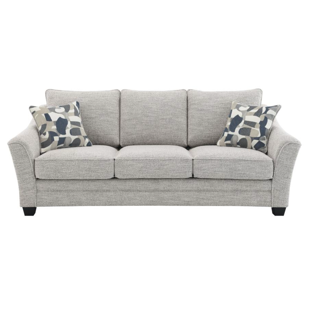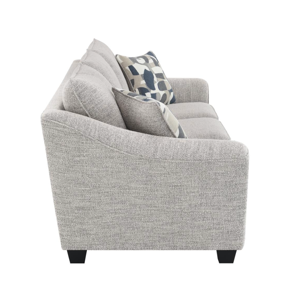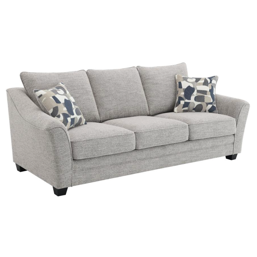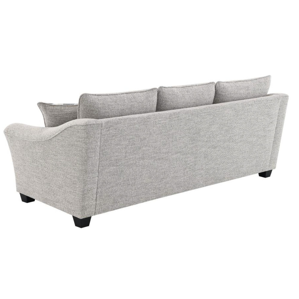 Create a comfortable and stylish living room with this beautifully tailored sofa collection. Wrapped in a multidimensional gray boucle fabric, this sofa not only adds rich texture but also effectively hides wear for lasting elegance. It features gently sloping arms, boxed seat cushions, and tall back pillows finished with welt trim for added refinement. A classic silhouette is modernized with flared armrests, bringing a fresh, updated look to your space. Sturdy tapering block legs in a dark finish provide reliable support while adding a touch of sophistication.