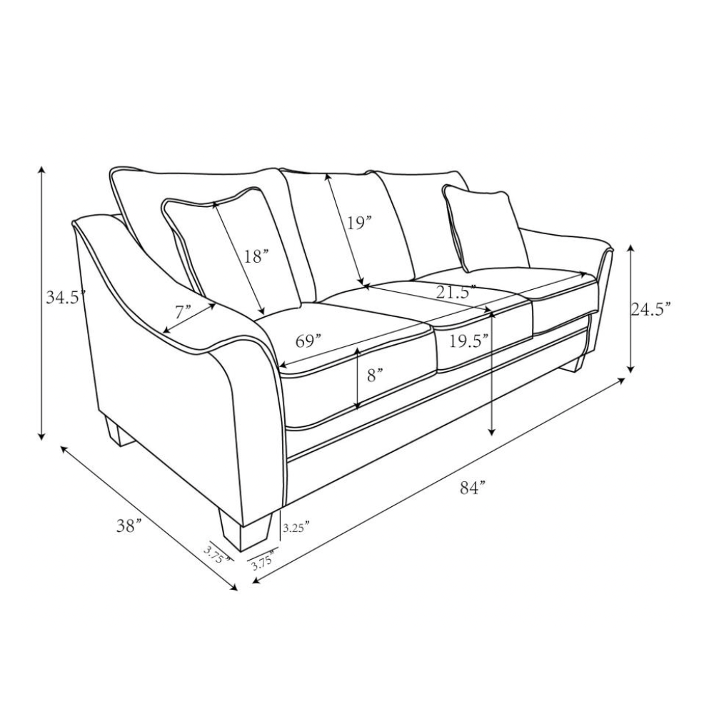 | 84.00" | 38.00" | 34.50" | 69.00" | 21.50" | 19.25" |