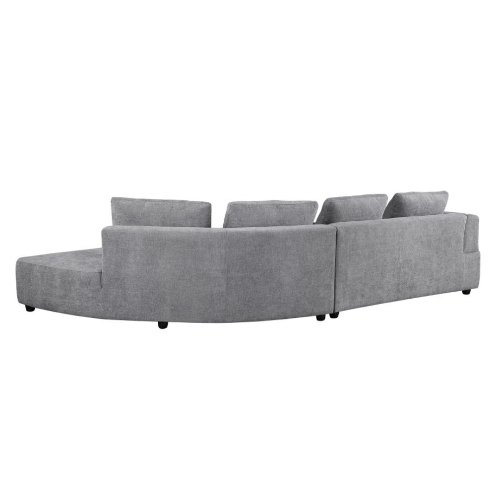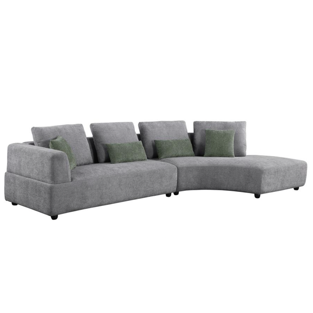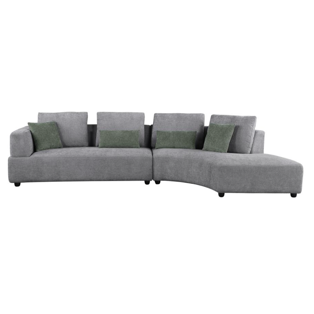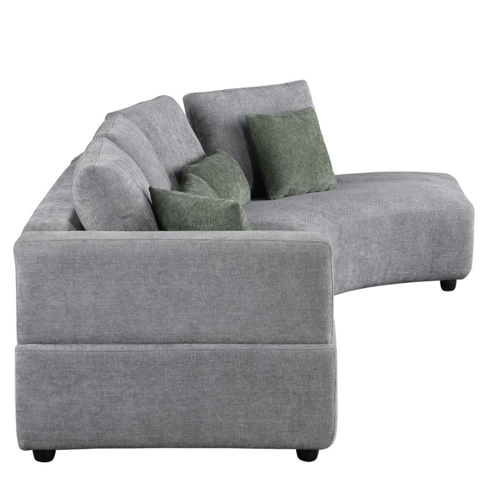 Anchor your living room with the dramatic elegance of this modern curved sectional sofa. Featuring a wide arm on one side and an open, graceful curve on the other, it creates a striking centerpiece in any space. Upholstered in soft gray fabric, it offers a neutral backdrop complemented by forest green accent pillows for a hint of organic charm. The compact, dark-finished round feet add height and an airy feel, perfect for sophisticated lounging or entertaining.