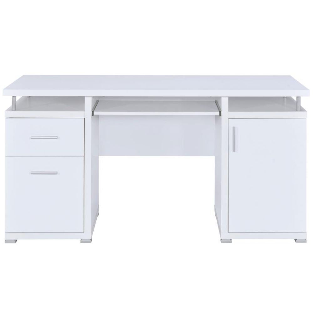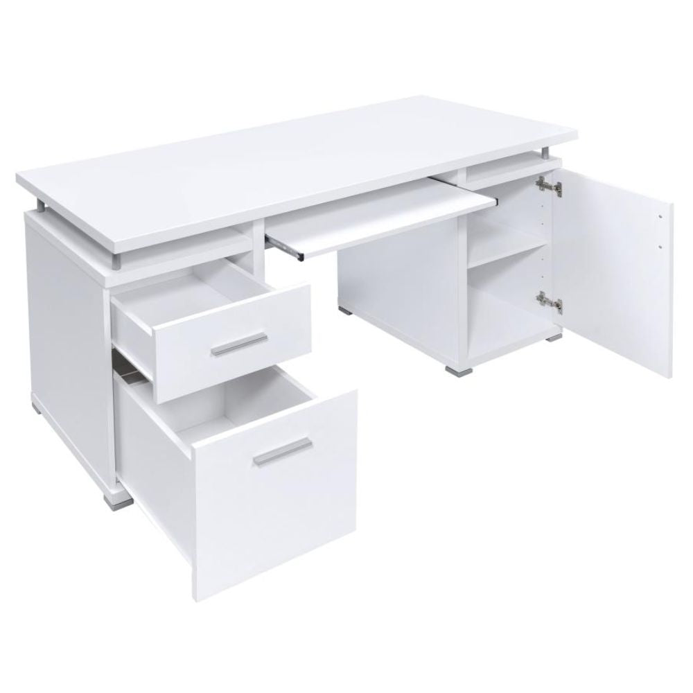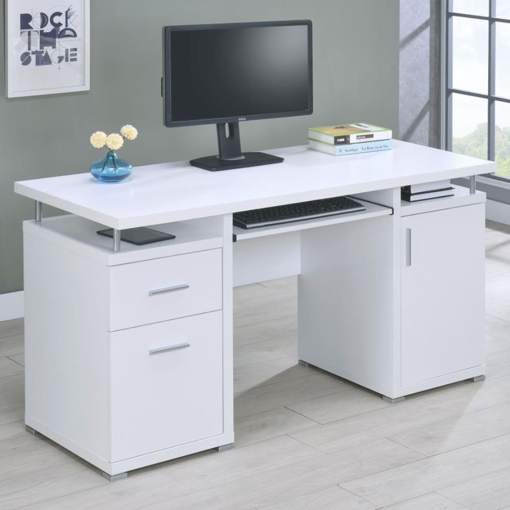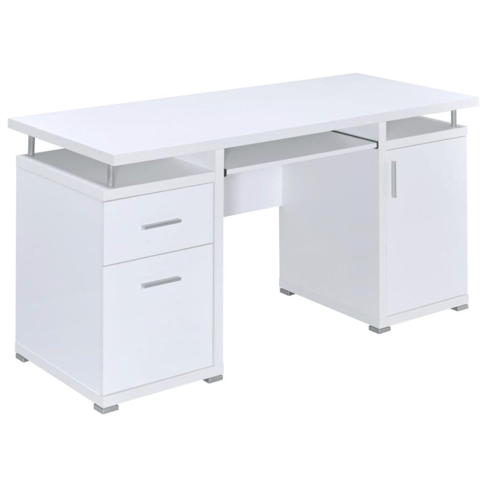 Elevate your home office with the perfect blend of style and functionality. This contemporary computer desk showcases an elegant white finish complemented by sleek silver metal detailing, creating a chic and modern aesthetic. Designed for convenience, it offers ample storage solutions, including a cabinet with an adjustable shelf, a spacious file cabinet, and a smaller upper drawer. The slide-out keyboard tray enhances its versatile appeal. Crafted from durable materials such as steel, MDF, particle board, and engineered veneer, this desk is built to withstand daily use, ensuring long-lasting productivity.