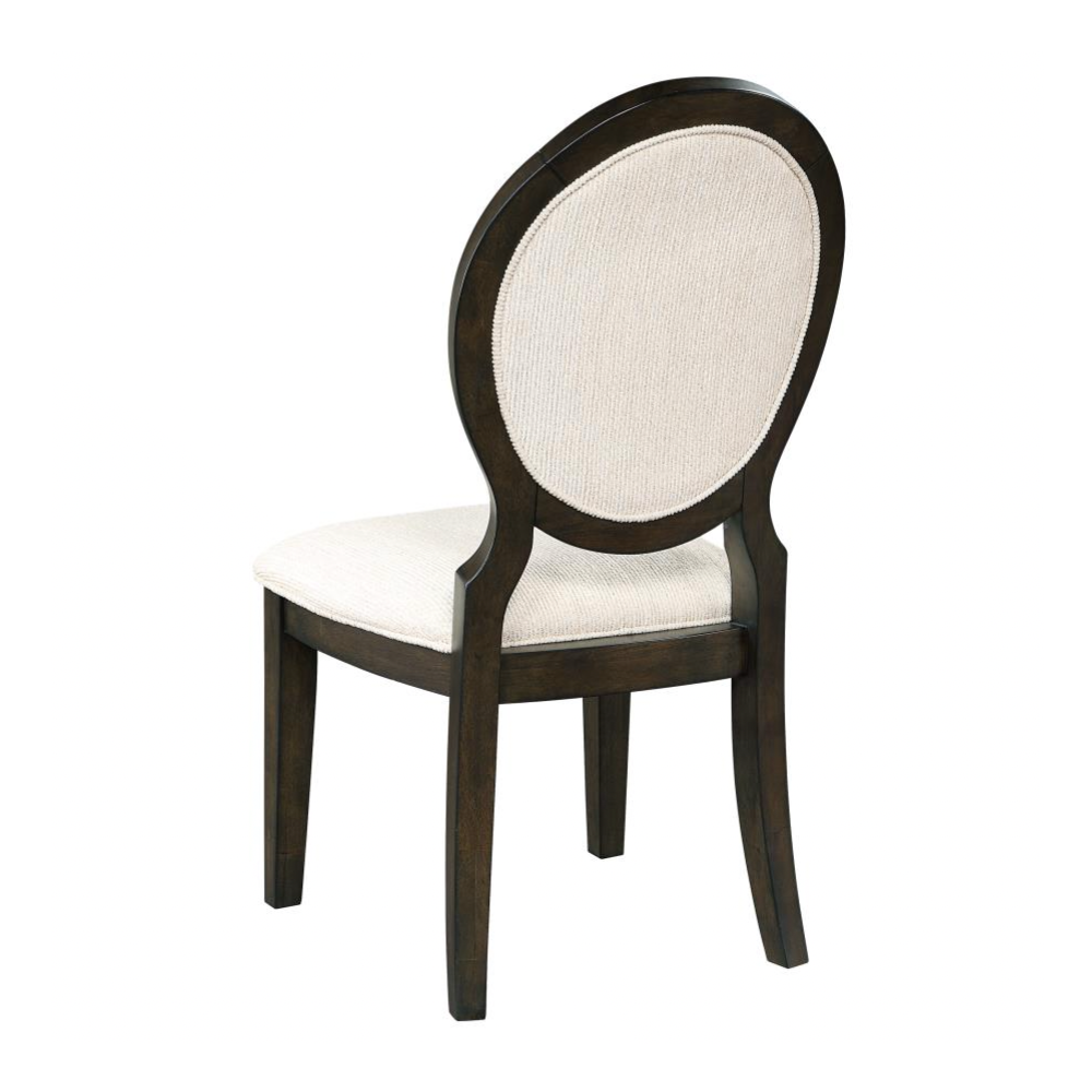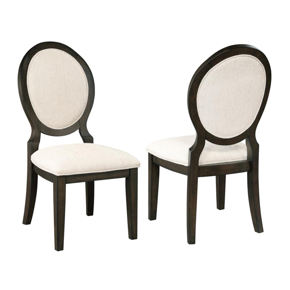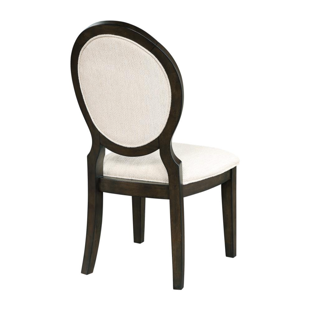 Elegant curves and timeless details make this transitional side chair a refined choice for any dining space. Inspired by Neoclassical design, the chair features a graceful oval backrest and gently flared legs, all finished in a rich dark cocoa tone that contrasts beautifully with the light cream upholstery. Both the seat and back are padded and wrapped in soft chenille fabric, offering lasting comfort for long meals and lively conversations. Welt trim adds a tailored touch, while sturdy construction ensures this chair blends beauty with everyday functionality.
