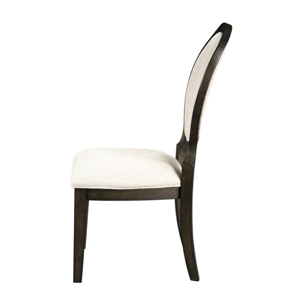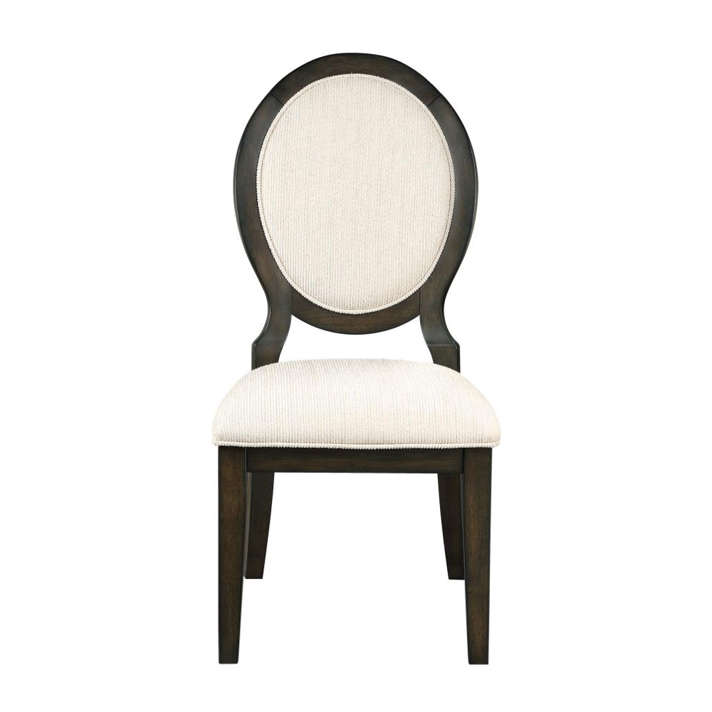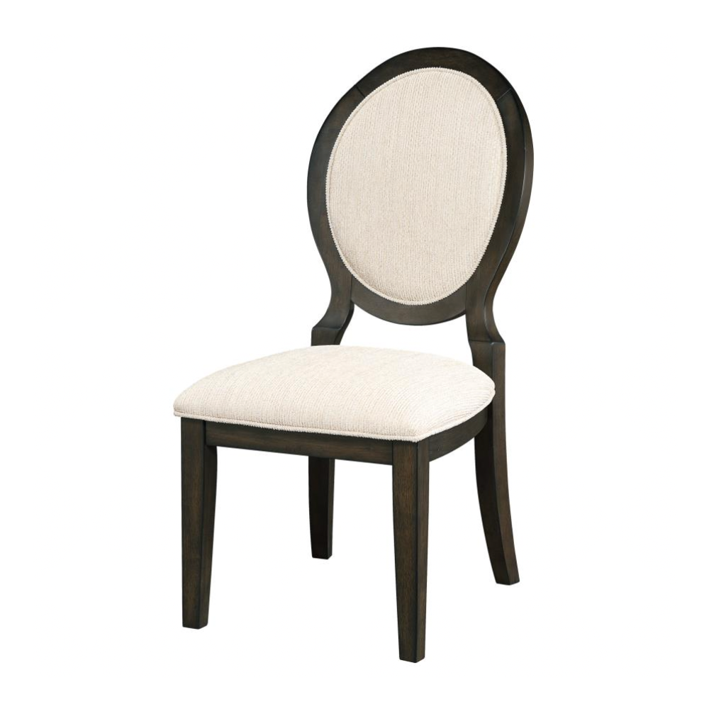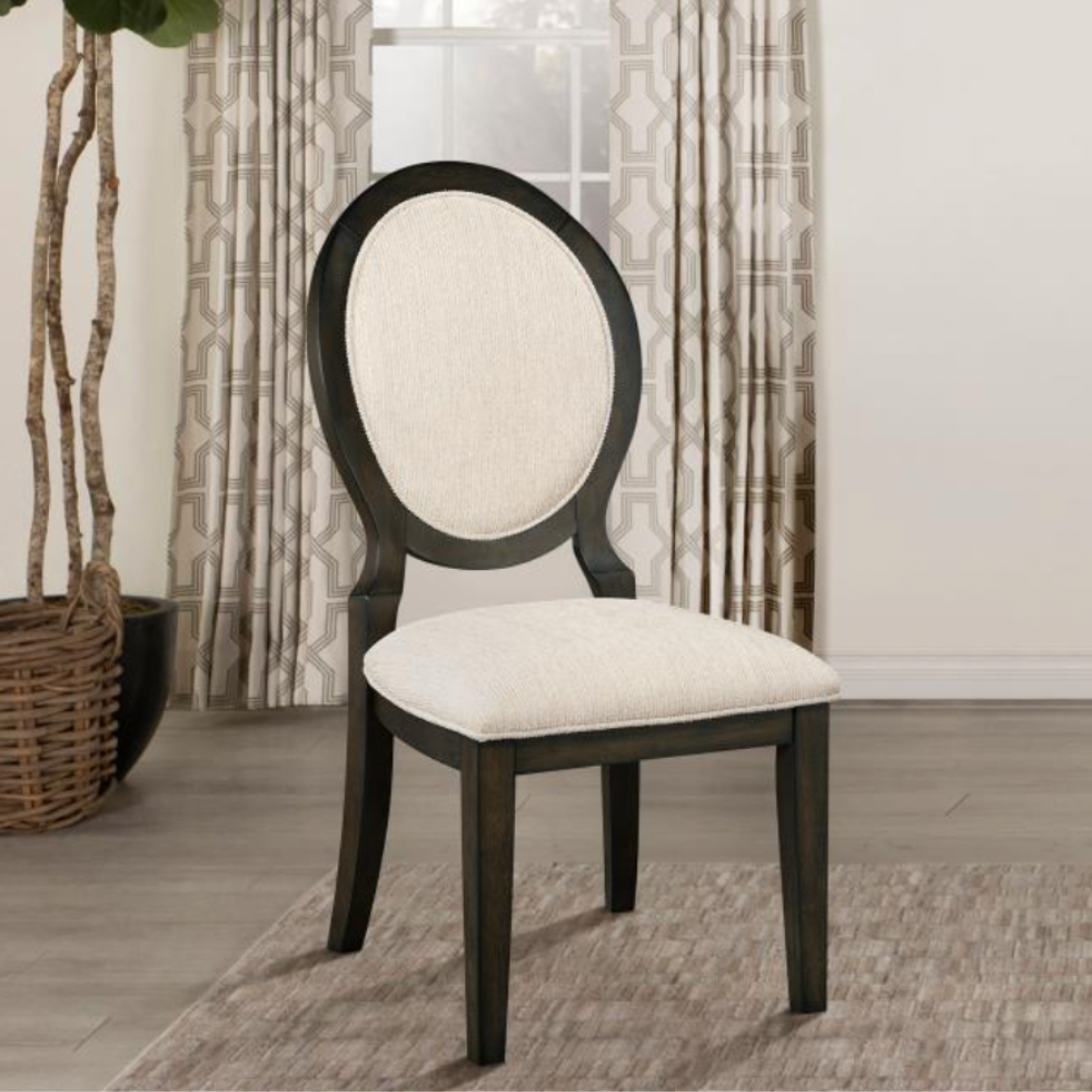 Elegant curves and timeless details make this transitional side chair a refined choice for any dining space. Inspired by Neoclassical design, the chair features a graceful oval backrest and gently flared legs, all finished in a rich dark cocoa tone that contrasts beautifully with the light cream upholstery. Both the seat and back are padded and wrapped in soft chenille fabric, offering lasting comfort for long meals and lively conversations. Welt trim adds a tailored touch, while sturdy construction ensures this chair blends beauty with everyday functionality.