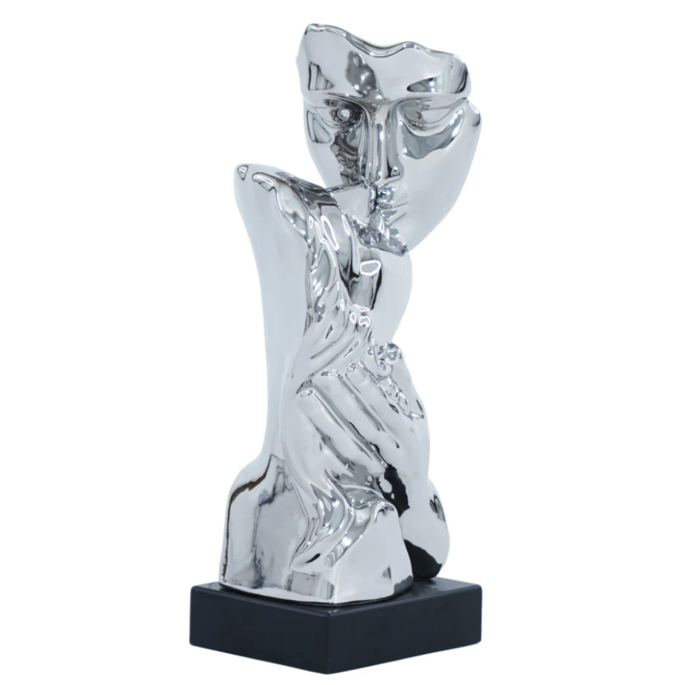 Add a touch of love and mystery to your space with this captivating kissing faces sculpture. The elegant design creates a modern illusion where the male face is gently supported by a female kiss, perfectly capturing the essence of passion and connection. Crafted from the highest quality ceramic material and finished in a high gloss white, this sculpture is displayed on a dark wooden base, making it a striking centerpiece for any room.