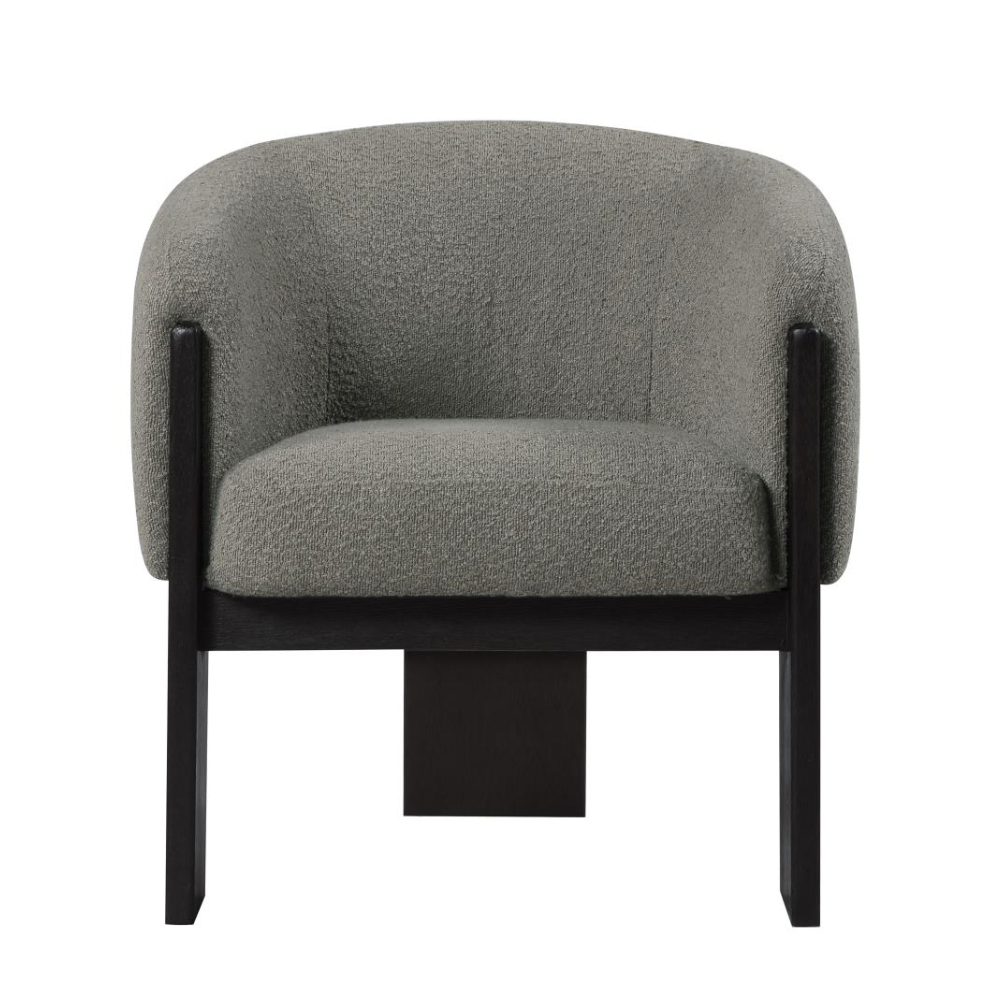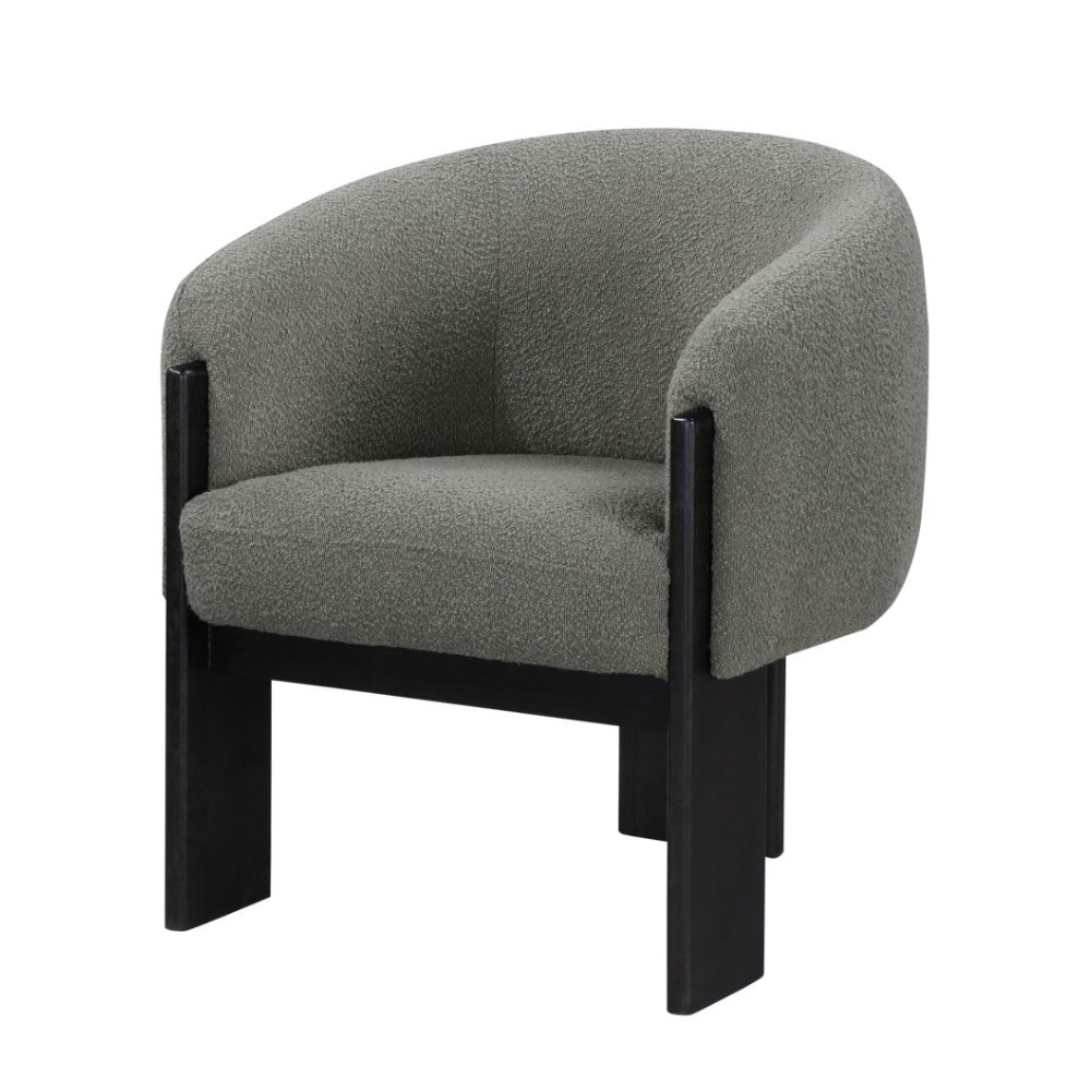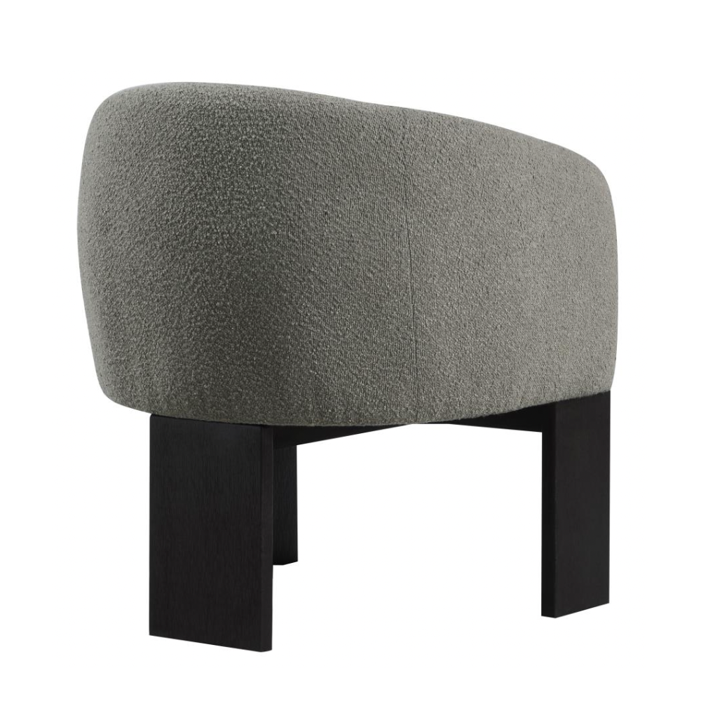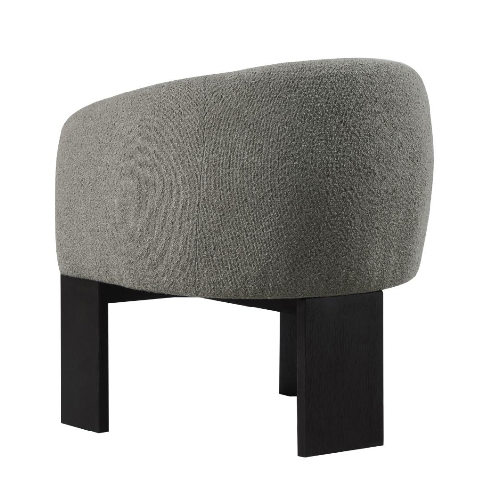 Enhance your living space with the updated style and sophistication of this modern accent armchair. Featuring a rounded silhouette with sloping arms, this chair offers a contemporary yet welcoming design. The textured boucle upholstery adds a layer of richness and depth, while three sculptural black-finished legs provide an artistic flair. Plush foam cushions ensure optimal comfort, making it perfect for both entertaining and relaxation.