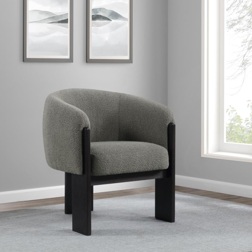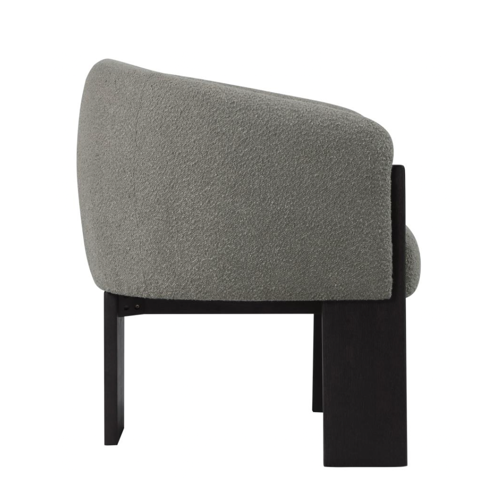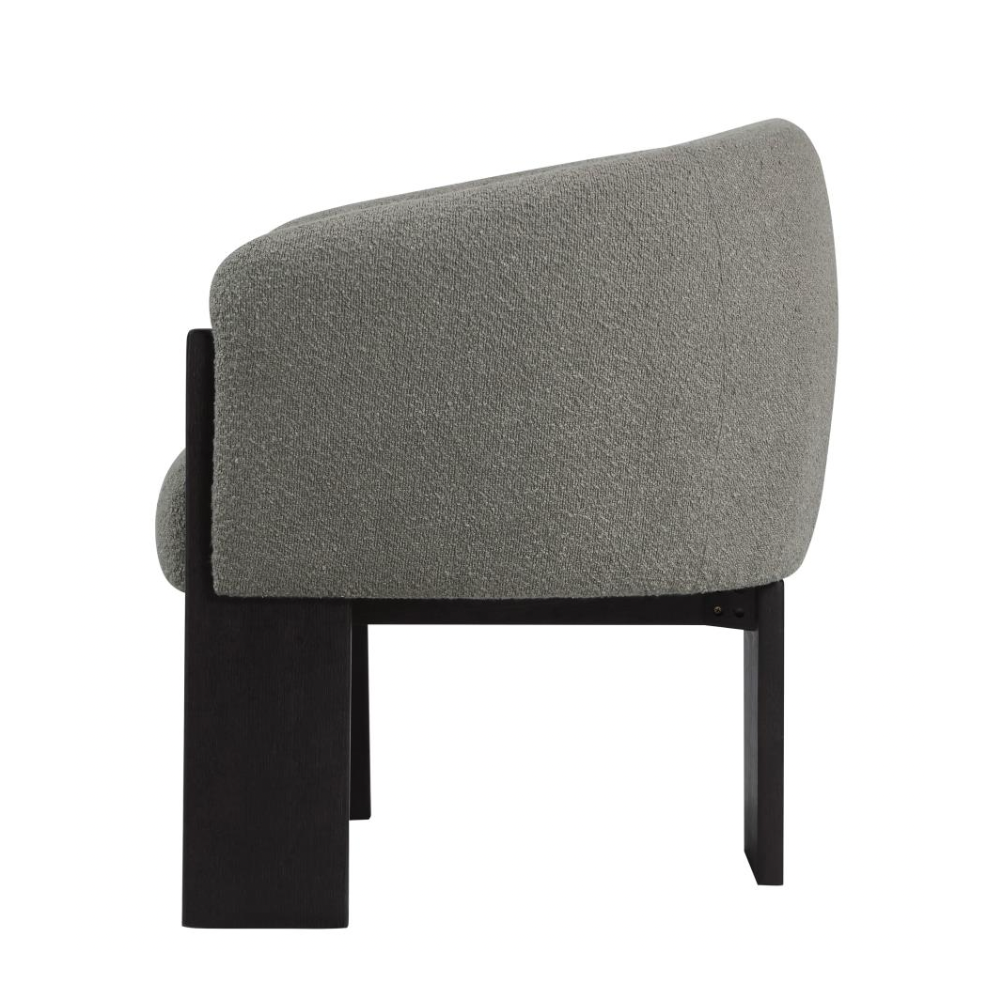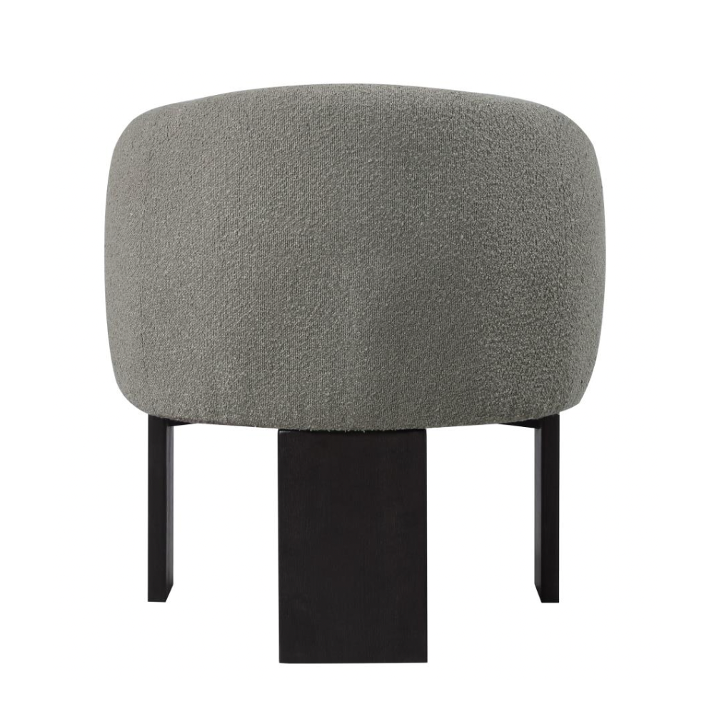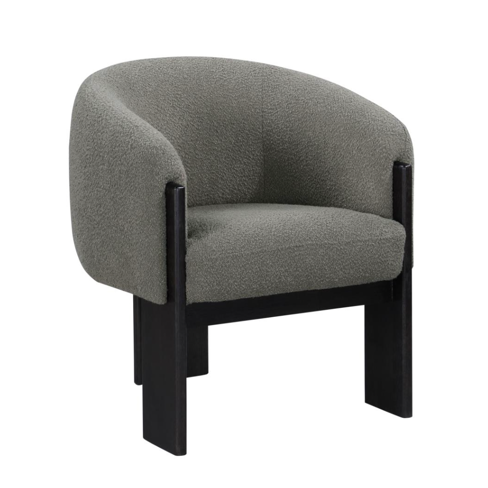 Enhance your living space with the updated style and sophistication of this modern accent armchair. Featuring a rounded silhouette with sloping arms, this chair offers a contemporary yet welcoming design. The textured boucle upholstery adds a layer of richness and depth, while three sculptural black-finished legs provide an artistic flair. Plush foam cushions ensure optimal comfort, making it perfect for both entertaining and relaxation.
