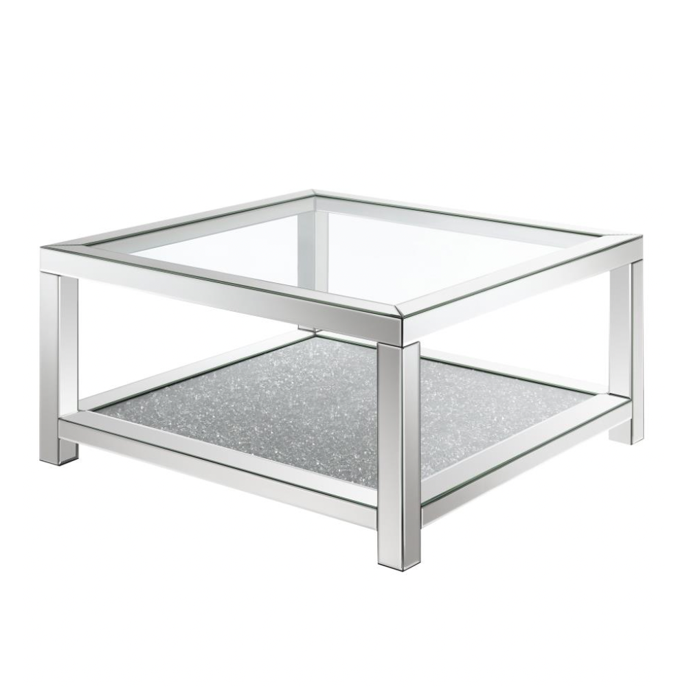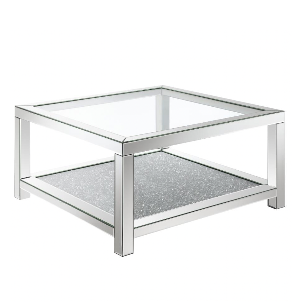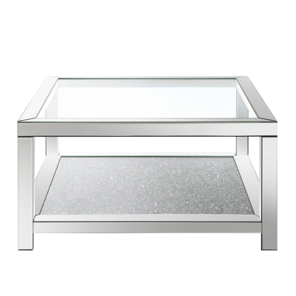 Make a dazzling statement in your living space with this glam mirrored coffee table, radiating Hollywood Regency style. Featuring a beveled mirror trim, clear tempered glass top, and an acrylic jewel-encrusted shelf, it adds sparkle and sophistication. Its open design and mirrored accents elevate any glamorous or contemporary interior.