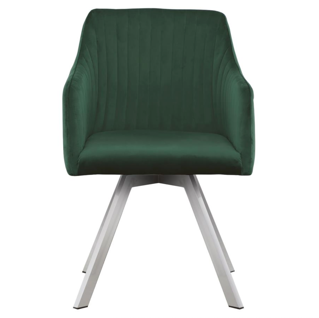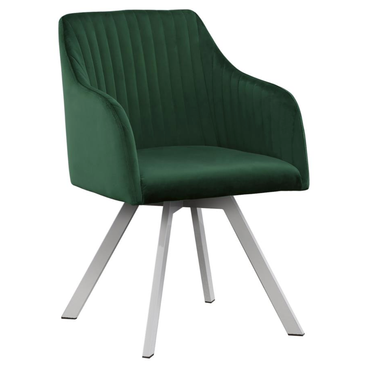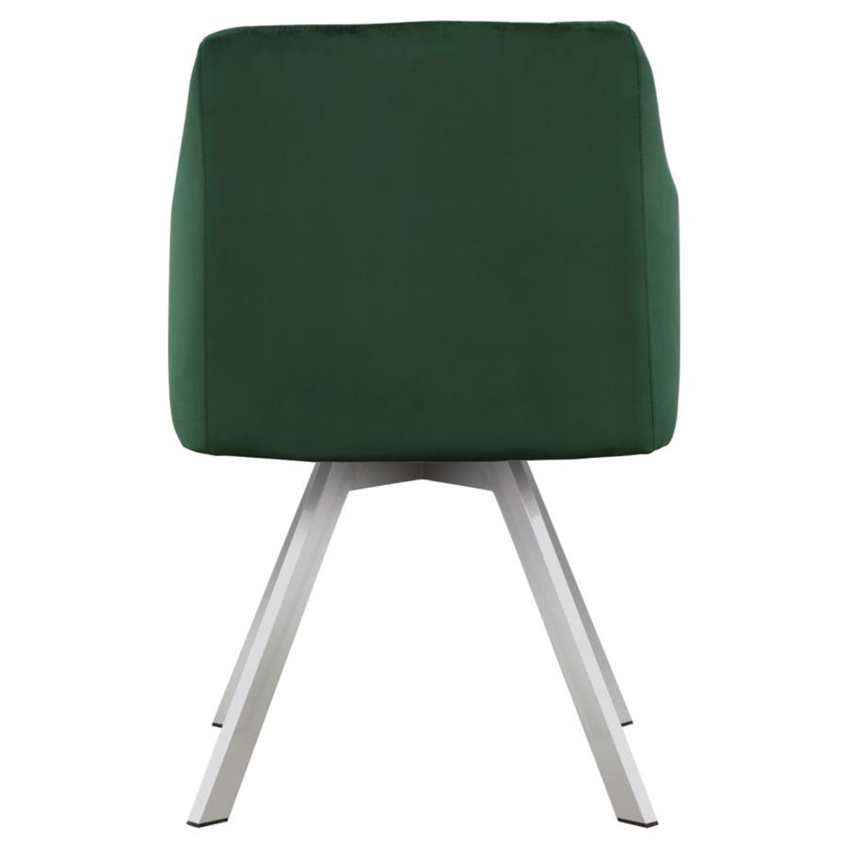 - Sumptuous Green Velvet Chairs: Surrounding the sculptural table are four sumptuous green velvet chairs, their channel tufted backs and swiveling seats exuding luxury reminiscent of a bygone era. Despite their retro flair, these chairs offer contemporary comfort, inviting guests to relax and indulge in leisurely dining experiences.
