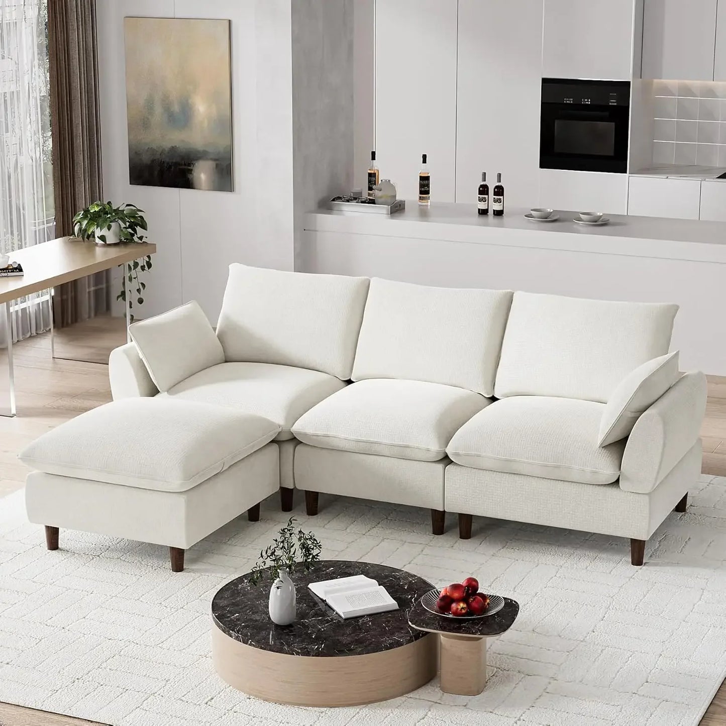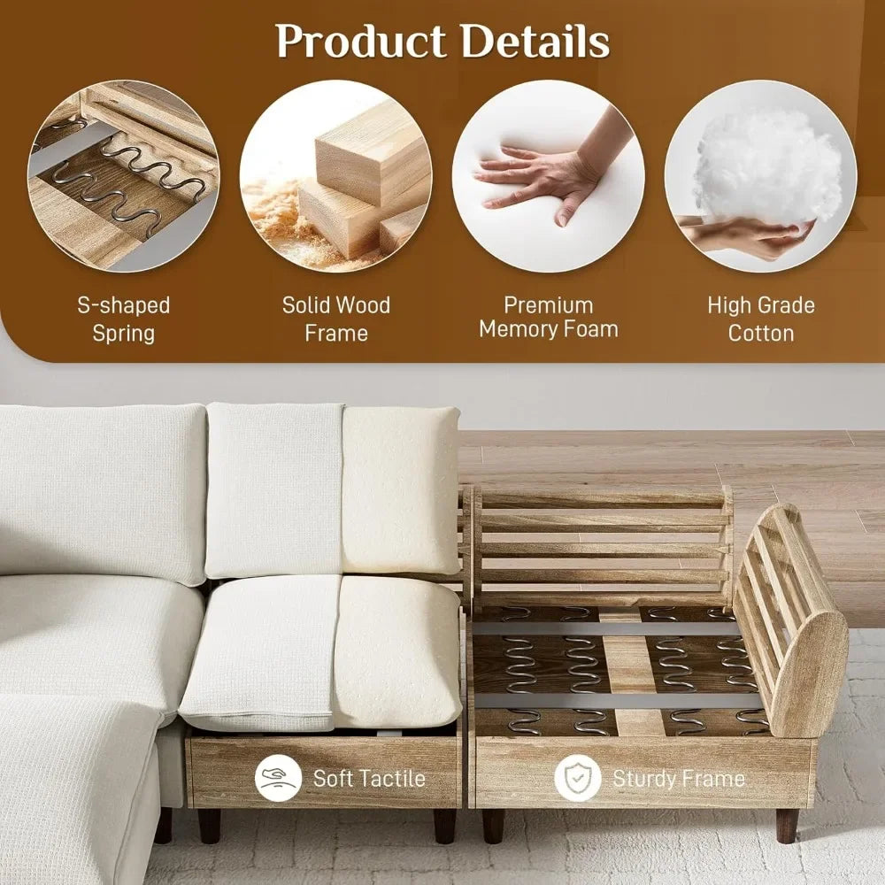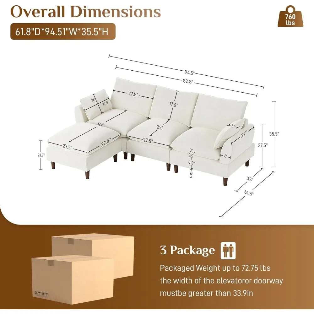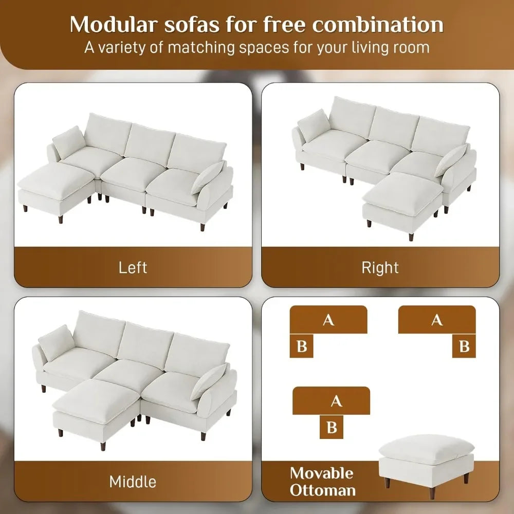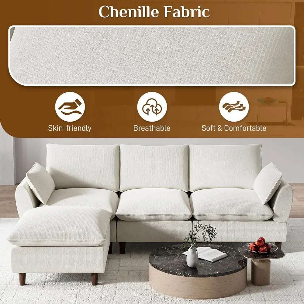 Lounge in luxury with this L-shaped cloud sectional, featuring memory foam, doll cotton, and S-springs for a plush, supportive feel. Upholstered in soft chenille fabric, this modular sofa includes five moveable pieces that adapt to any layout. With deep seats, removable covers, and a durable solid wood frame, it’s built for comfort and everyday living.