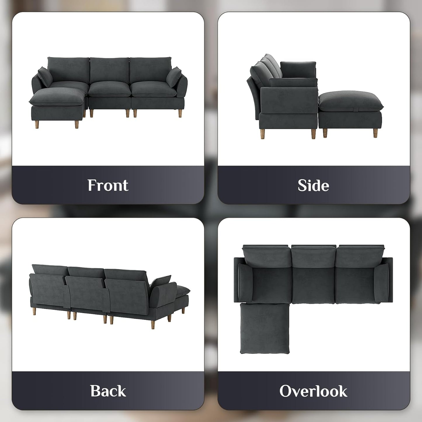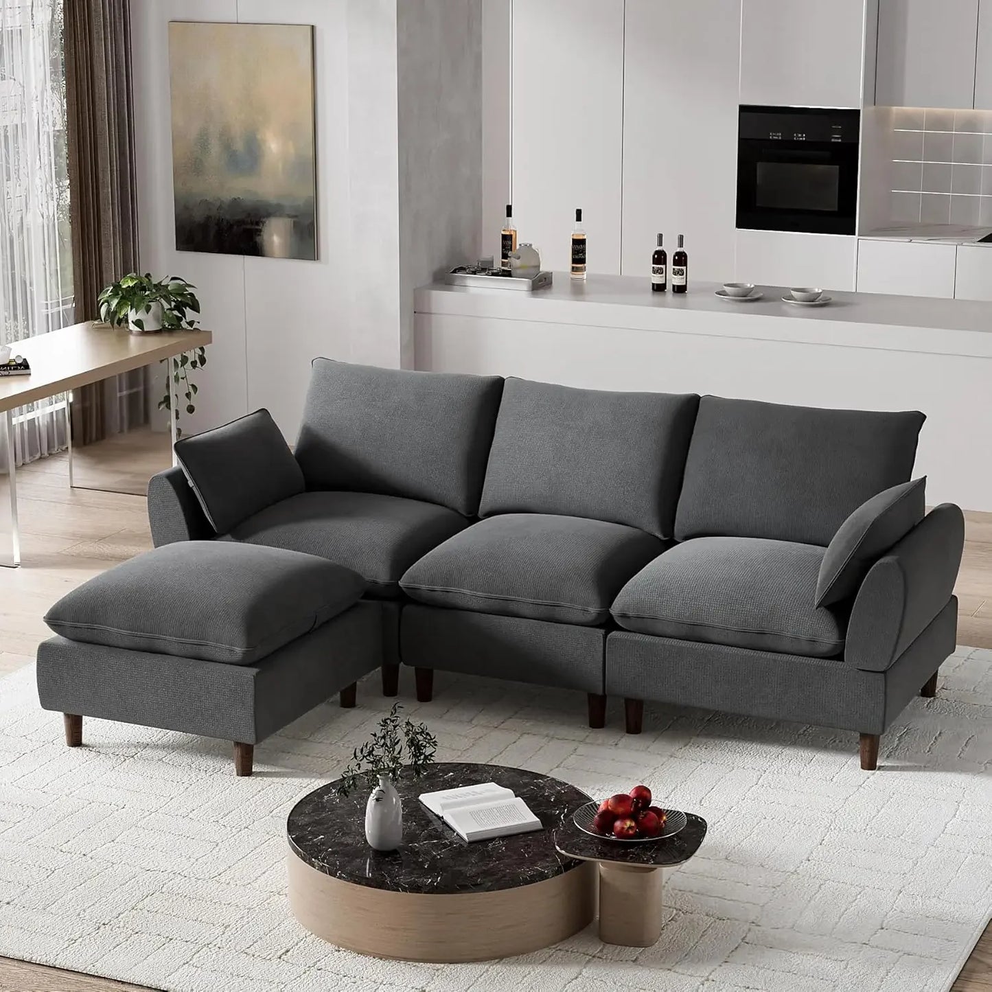 Lounge in luxury with this L-shaped cloud sectional, featuring memory foam, doll cotton, and S-springs for a plush, supportive feel. Upholstered in soft chenille fabric, this modular sofa includes five moveable pieces that adapt to any layout. With deep seats, removable covers, and a durable solid wood frame, it’s built for comfort and everyday living.