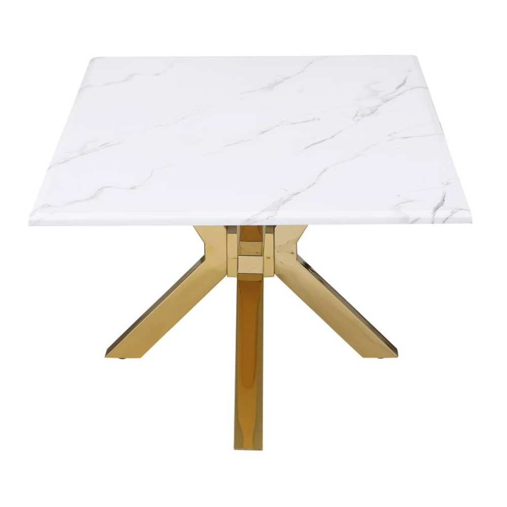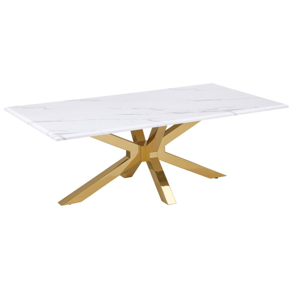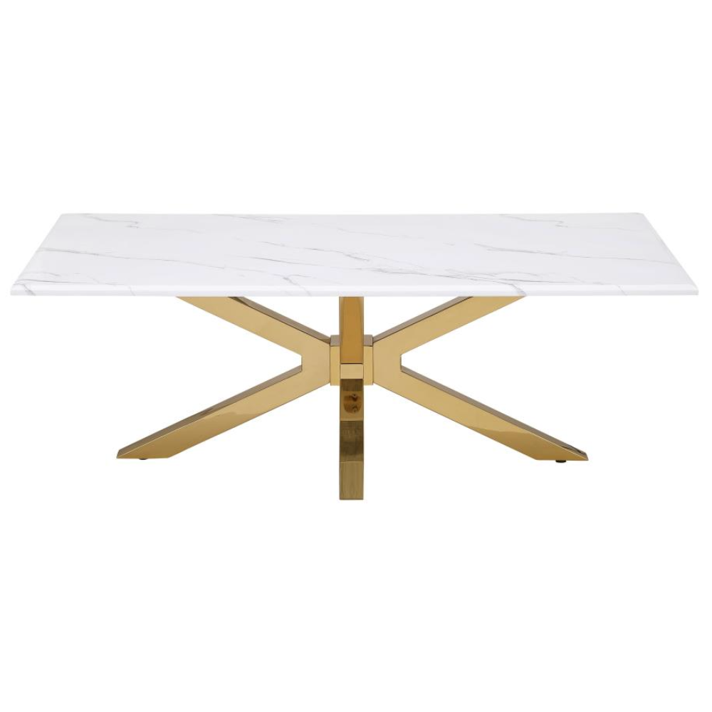 Create a luxurious centerpiece in your living room with this modern marble coffee table. Featuring a rectangular marble-like top with striking veining, it adds depth and character to your decor. The table is supported by a star-shaped, rust-proof stainless steel base in a gleaming gold finish, enhancing its glam sophistication. This exquisite piece is perfect for displaying flowers or sculptural decor, making it a true focal point in any space.
