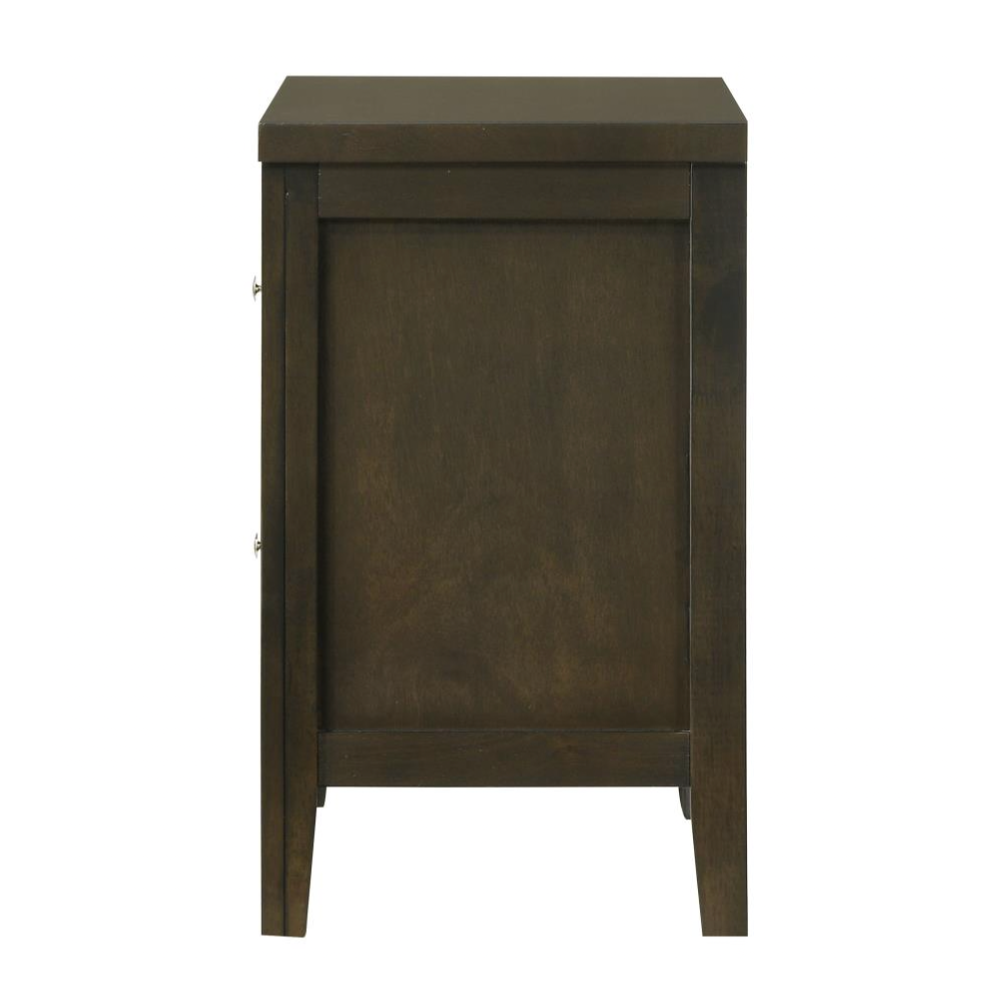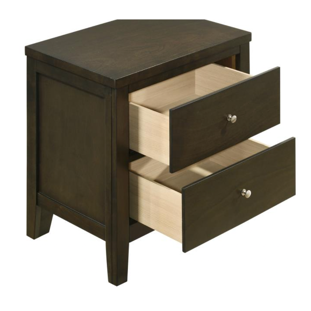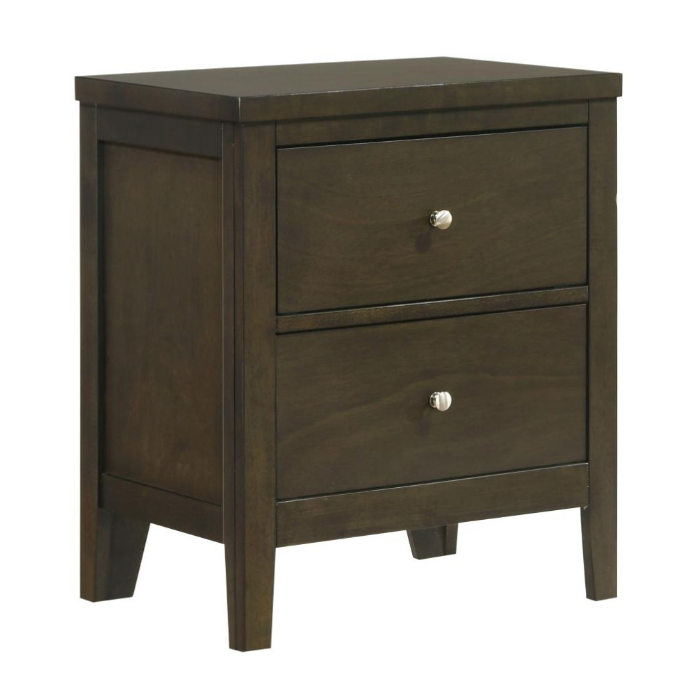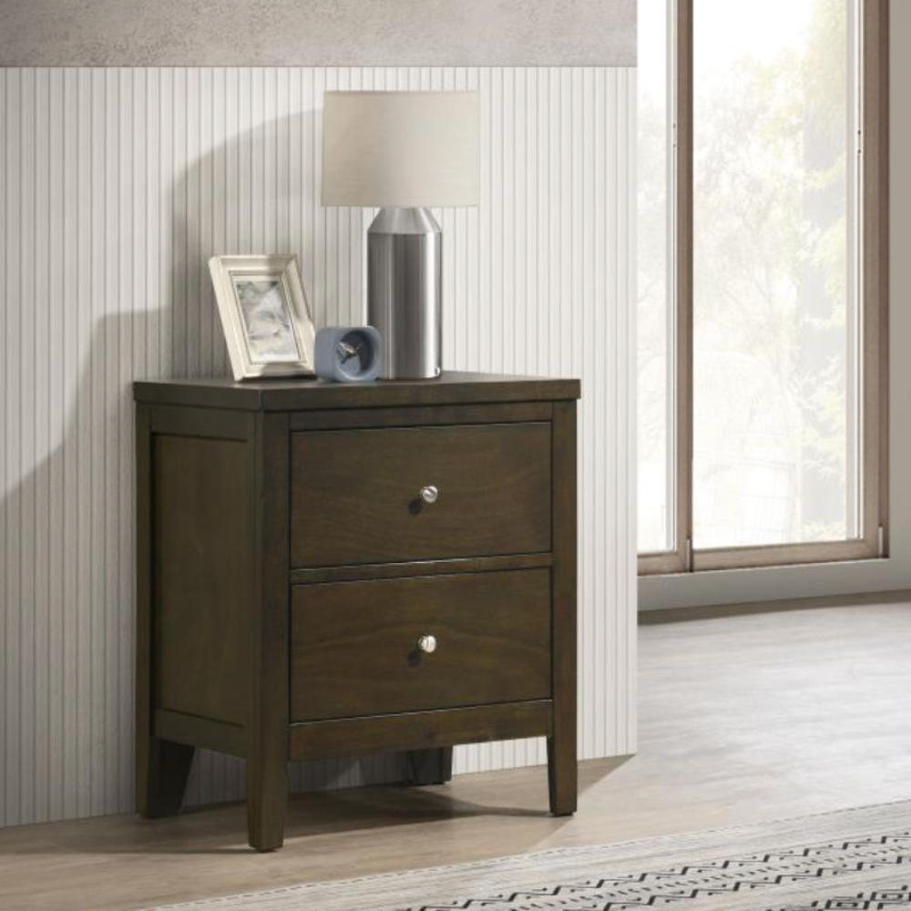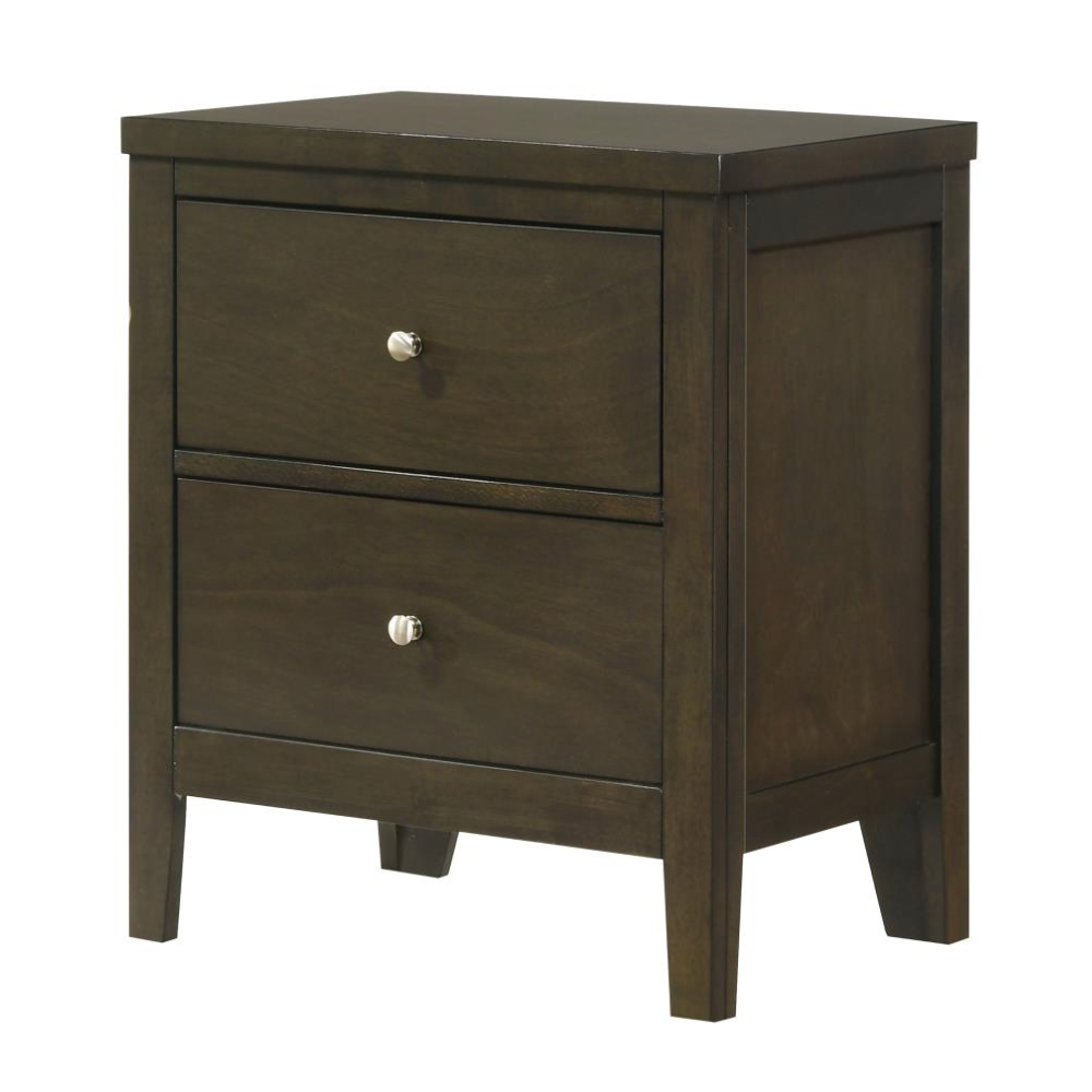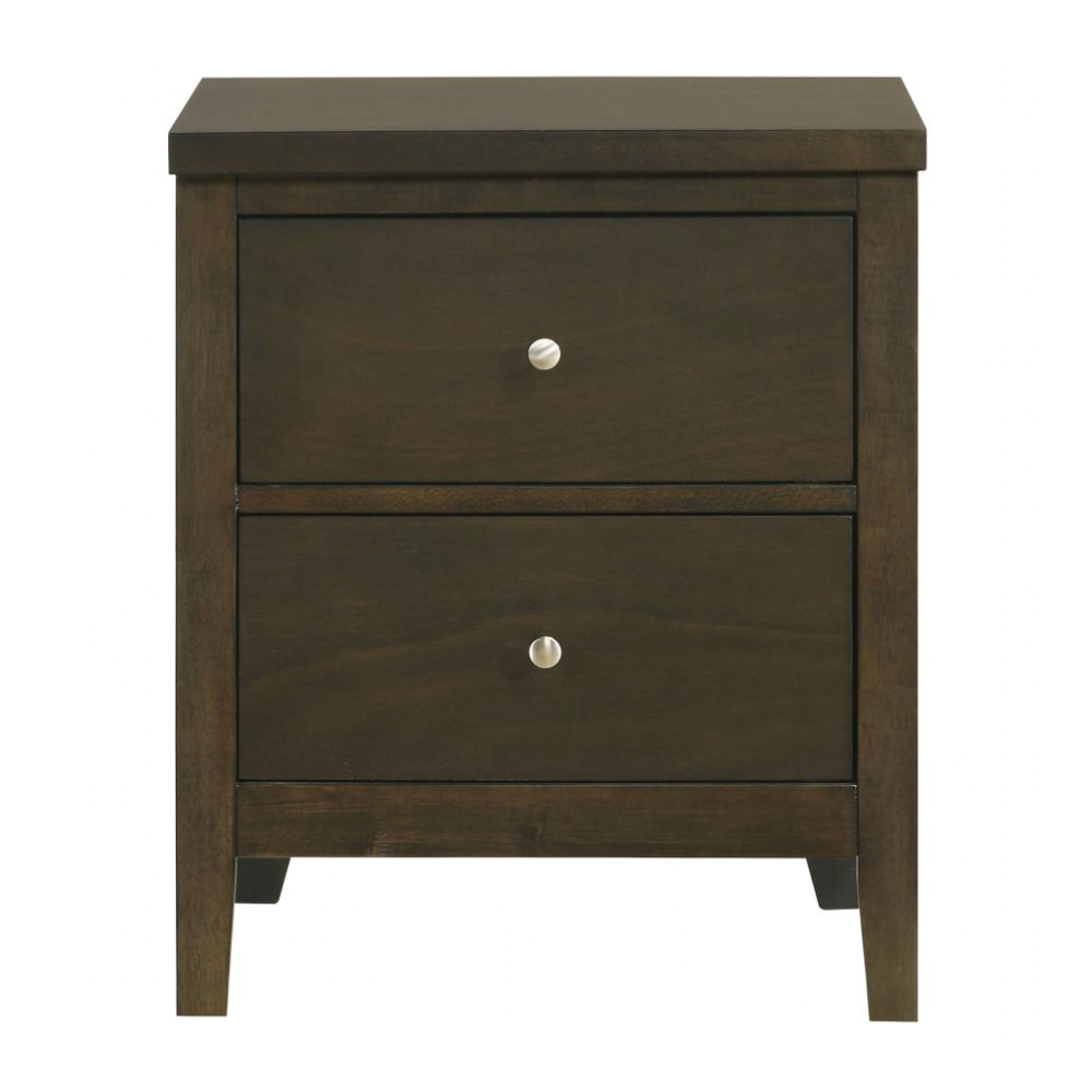 Add modern functionality to your bedroom with this sleek two-drawer nightstand. A warm dark cocoa finish pairs beautifully with brushed nickel hardware for a contemporary look. Deep drawers and durable materials ensure both style and everyday utility.