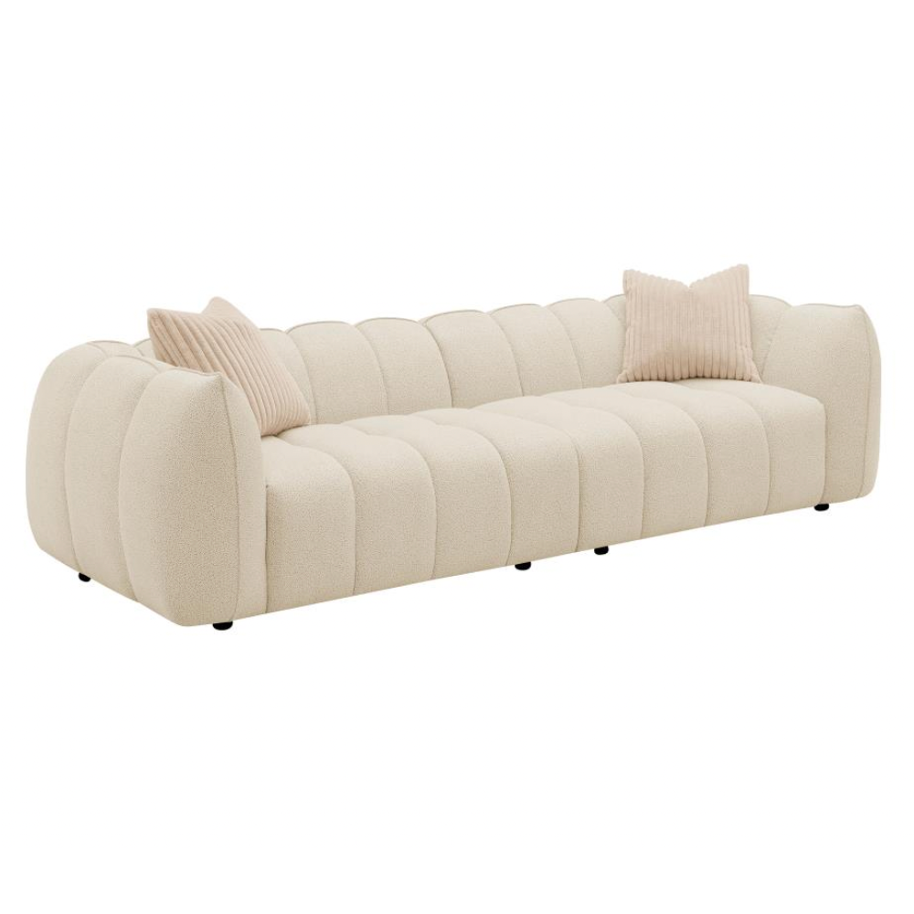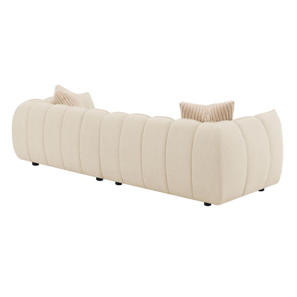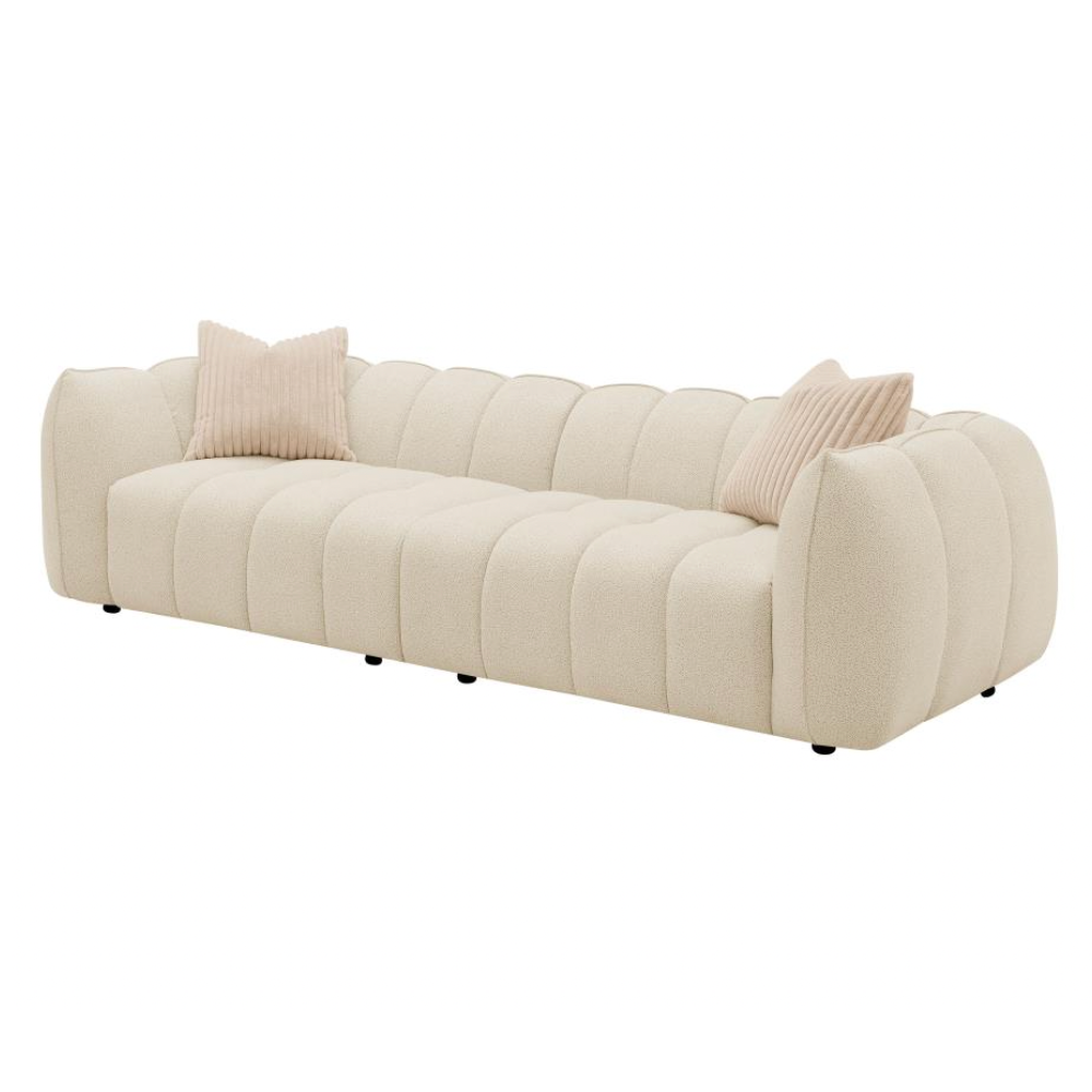 Create a cozy and stylish focal point in your living room with this modern extra-long sofa. Featuring a bubble-like silhouette and sand pebble boucle upholstery, it blends contemporary design with inviting warmth and texture. Wrap-around cushioning, a tufted waterfall bench seat, and wide piped armrests provide exceptional comfort for lounging or entertaining.