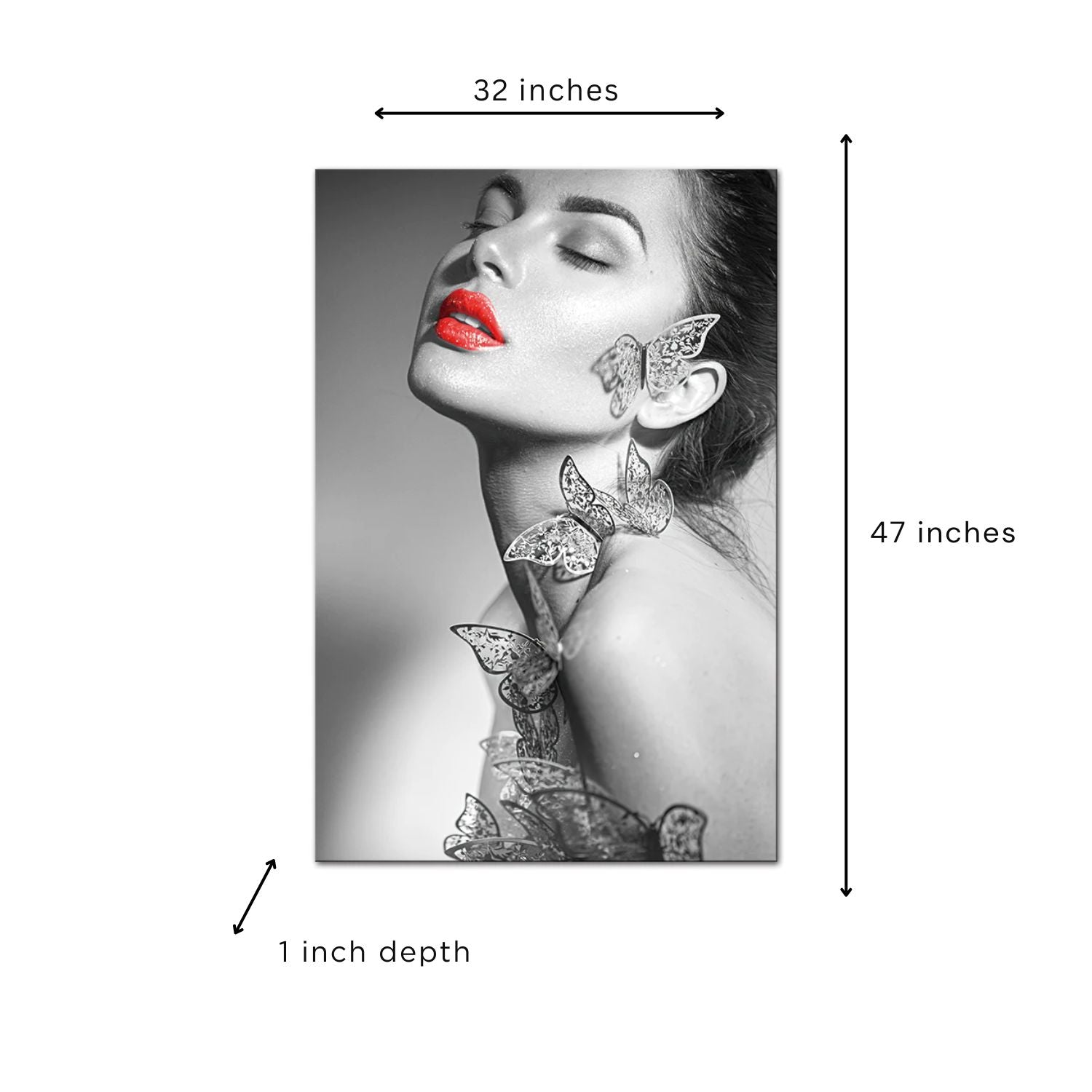 - Woman with Butterflies: Our Wall Art features a captivating depiction of a Woman with decorative butterflies that's beautifully transferred onto high-quality acrylic. This modern presentation method brings out the vibrancy of the artwork and creates a stunning visual impact.