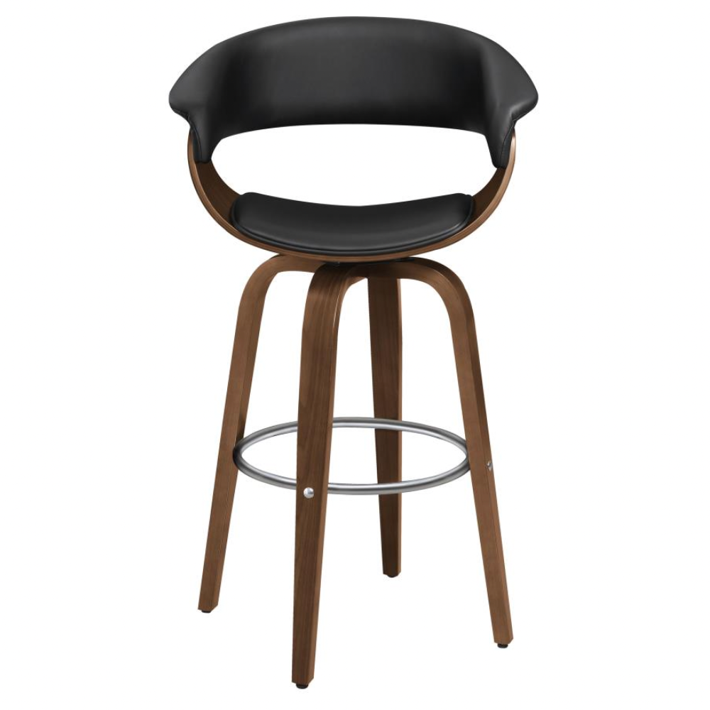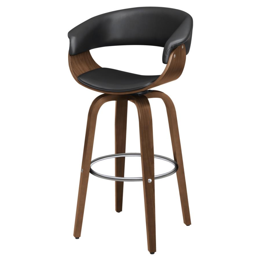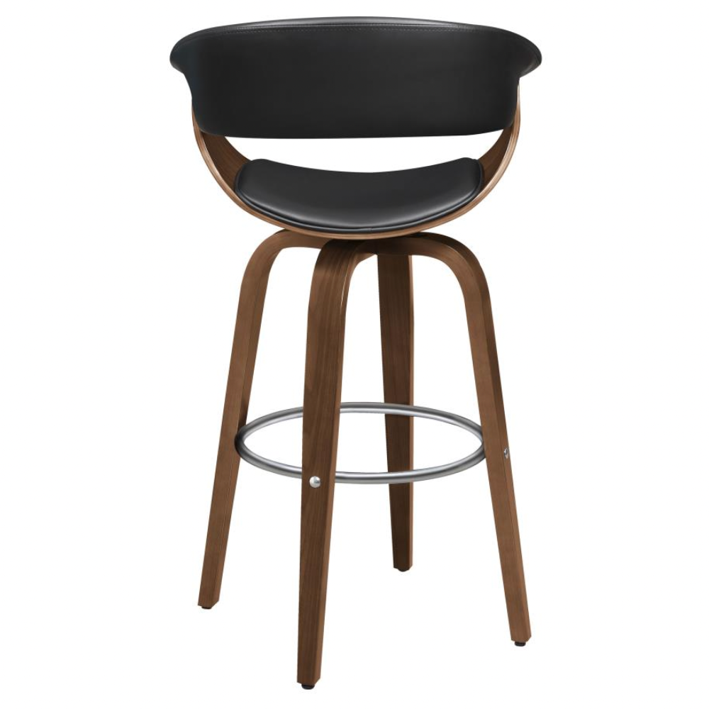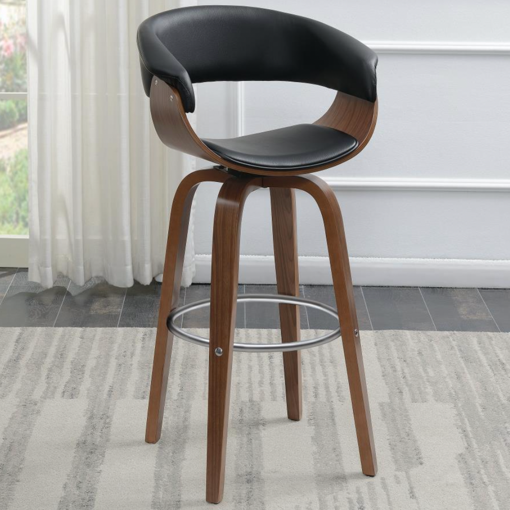 Accentuate the natural style of your kitchen island or breakfast bar with the inviting appeal of this charming swivel bar stool. Designed with a classic silhouette and sleek, elegant lines, this stool exudes timeless sophistication. The smooth black PU upholstery beautifully complements the understated walnut finish of its simple wooden base, creating a harmonious blend of textures and tones. A sturdy seat back and round foot base offer ergonomic support, making it the perfect seating choice whether you're enjoying a quick bite or savoring an elaborate meal.